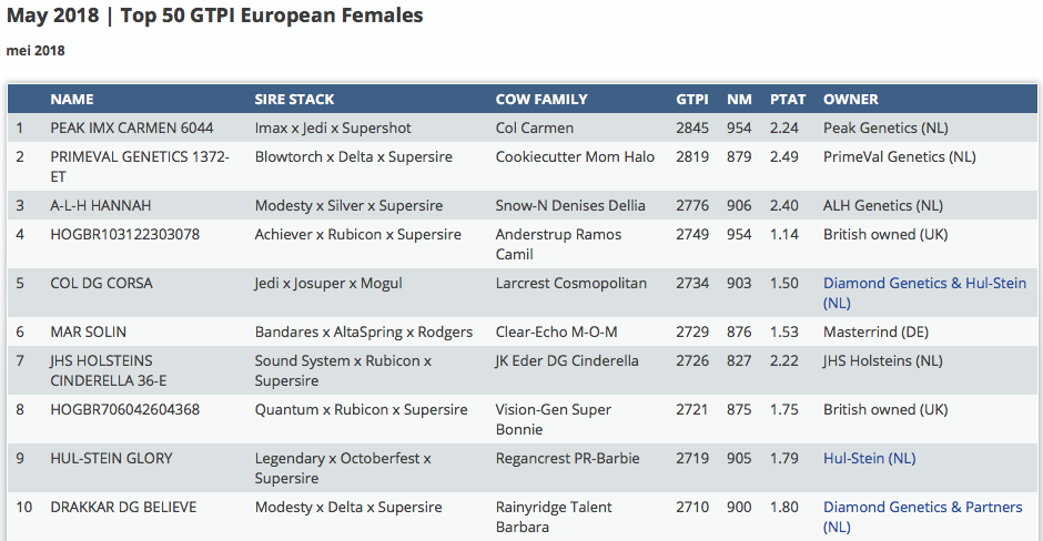 Several Eurogenes members had a good run during this intermediate run, highest was COL DG Corsa a Jedi x Josuper x Larcrest Cosmopolitan family. What is so special about this heifer is that she has +2734 GTPI, but is the #1 heifer in Europe for pounds of protein with +92 and the number 10 world wide! Hul-Stein Glory and Drakkar DG Believe complete the top 10 with +2719 and +2710 GTPI, both out of great families!