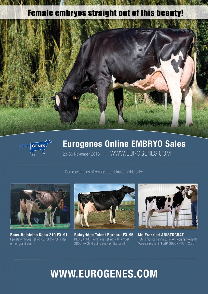 Invest in the best through the Eurogenes Online Embryo Sale - The embryo sale offers the very best, including many female embryo combinations in the top of the breed for index, show and more! Embryos are selling out of the mother to ARISTOCRAT, embryos from the family of the recently sold Bons-Holsteins Koba 219 and many more!