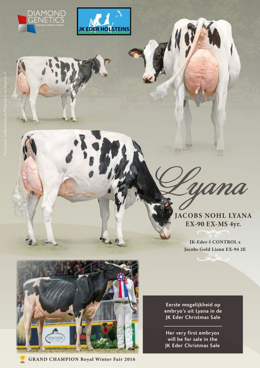 Jacobs Doorman Victoire, the Reserve Intermediate Champion, World Dairy Expo 2019, has increased her score to EX-95-USA this week! Victoire won multiple titles like Intermediate & Honerable Mention Grand Champion, Royal Winter Fair 2019, 1st Senior Three Year Old, International Holstein Show 2019, Nominated All-Canadian, Senior Two Year Old 2018 and many more! She is sired by Doorman out of Jacobs Goldwyn Voltige VG-89-CAN backed by Jacobs Spirit Valsie EX-92-CAN 2E 9*. Victoire is bred by Ferme Jacobs and sold to the USA. In the CHRISTMAS @ JK Eder TAG+ Sale are embryos selling out of a daughter from an another successfull showcow bred by Ferme Jacobs! She is a EXCELLENT Control daughter out of Jacobs Gold Liann EX-94-CAN EX-95-MS: Jacobs Nohl Lyana EX-90-NL, her embryos are selling as Lot 1!