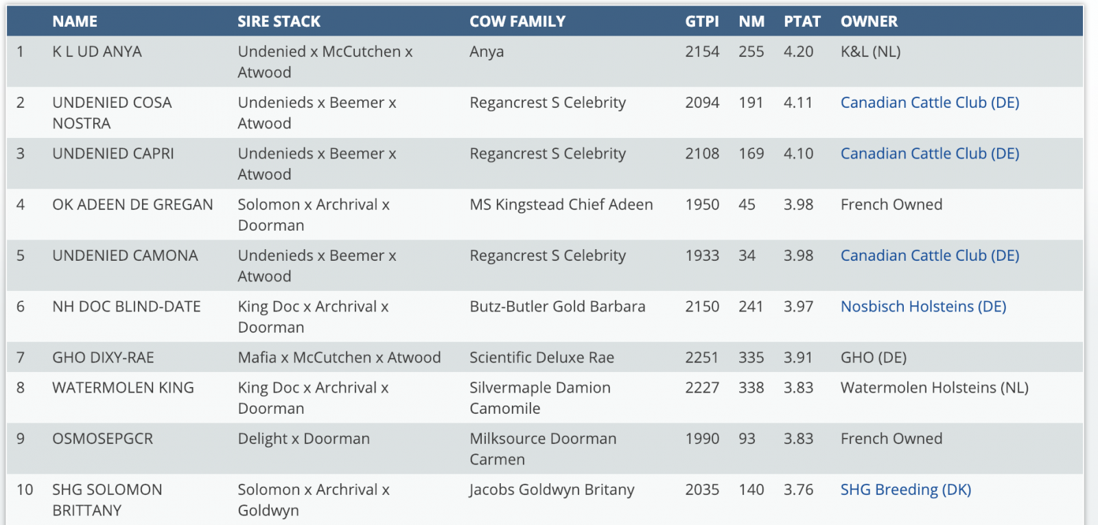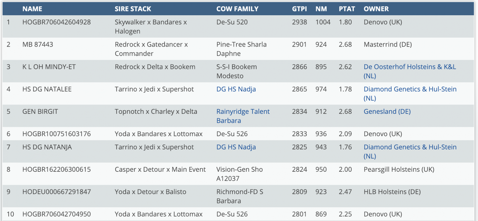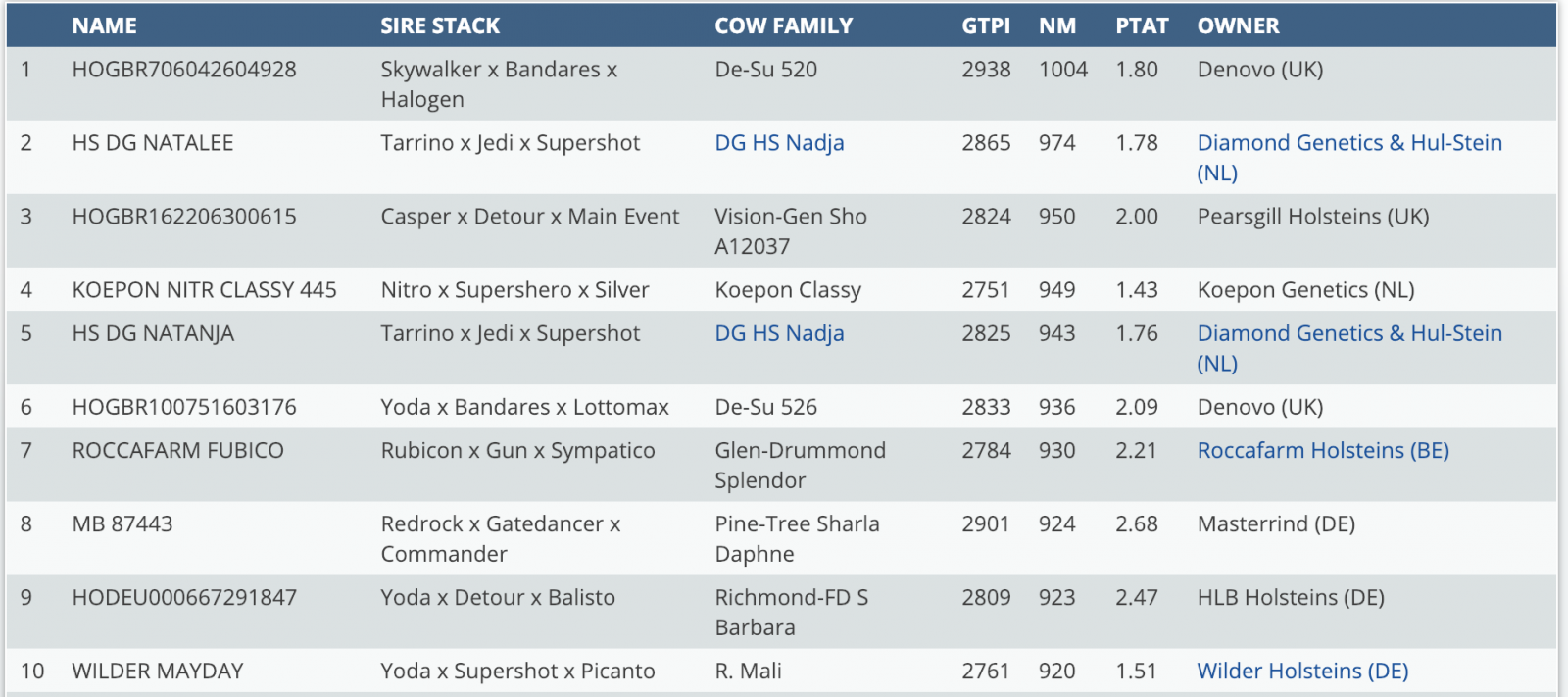 Happy new year to everybody! 2019 start off with some skyhigh new European females, animals which can compete in the global index top for GTPI & Net Merit. DG HS Nadja is getting herself a status as a Genomic Giant more and more, in January she delivered her 5th direct son or daughter >2800 GTPI, with this run 2 heifers in the Top 10 for GTPI, which are also both in the Top 5 for Net Merit, up to GTPI +2865 and 974 Net Merit! Many Eurogenes members found females in the top of the rankings this run, like Canadian Cattle Club (3 in the Top 5 PTAT), Wilder Holsteins (A Top 10 Net Merit), Genesland (a top 5 GTPI), Roccafarm Holsteins (A Top 10 Net Merit) and more! Click further for more the complete rankings!