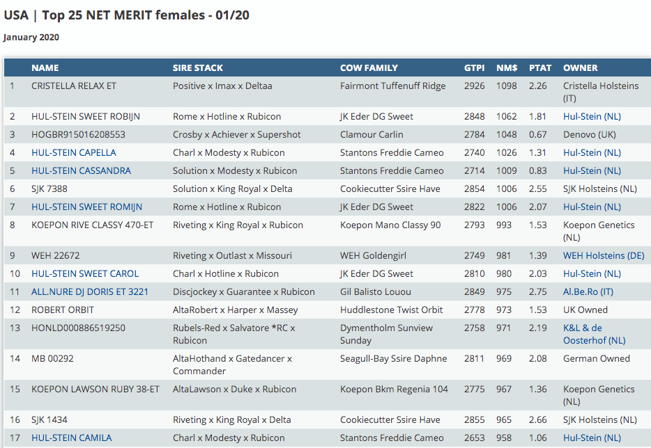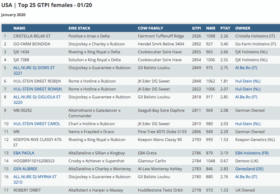 The January intermediate run based on the American GTPI index is online available now!! Topping the GTPI list is Positive daughter Cristella Relax ET with no less than +2926 GTPI. She is followed by Go-Farm Bondida with +2892 GTPI in a unique combination with +3.40 PTAT!! Furthermore in the top 5 we find All.Nure DJ Doris ET 3221 with +2849 GTPI and +975 Net Merit, a Discjockey daughter from the Gil Balisto Loulou family. The #1 PTAT female is Pereira Crushabull Camilla with +4.18 PTAT and backed by Silvermaple Damion Camomile. Second in the list is Al-Lew Monterey Ashley VG-89-USA EX-MS La1. her Crushabull daughter Atlantis-ET with +4.08 PTAT. Also the very first Crushtime daughters are testing high with six daughters in the top 25!!