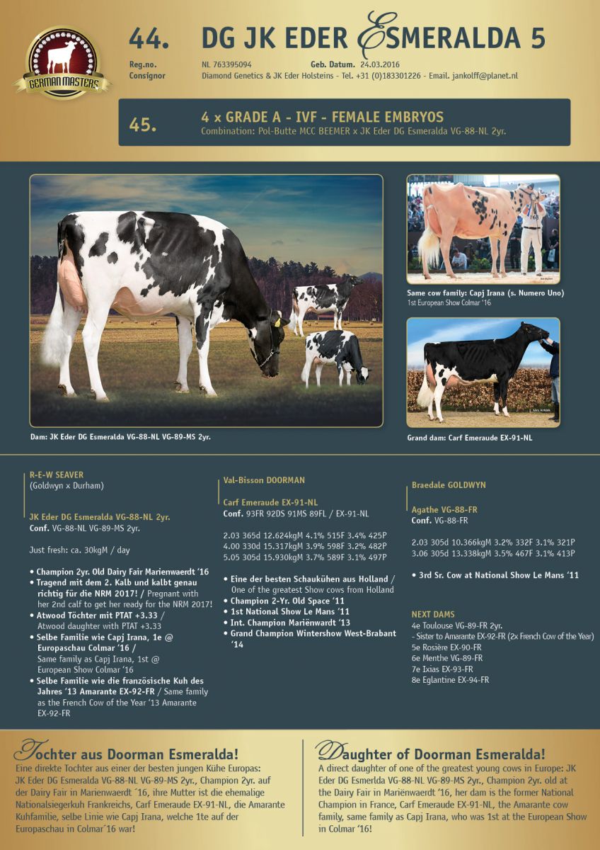 JK Eder DG Esmeralda VG-88-NL VG-89-MS 2yr., one of the most promising 2yr. olds in Europe won the Reserve 2yr. Old Championships at the countyshow in Hoornaar! She is sired by the great type sire: Val-Bisson Doorman and comes from a great cow family. Her dam is the former French National Champion cow Carf Emeraude EX-91, and is from the same family as the 2x French Cow of the Year: Amarante EX-90. Esmeralda her Seaver daughter will sell the 21st of October in the German Master Sale!