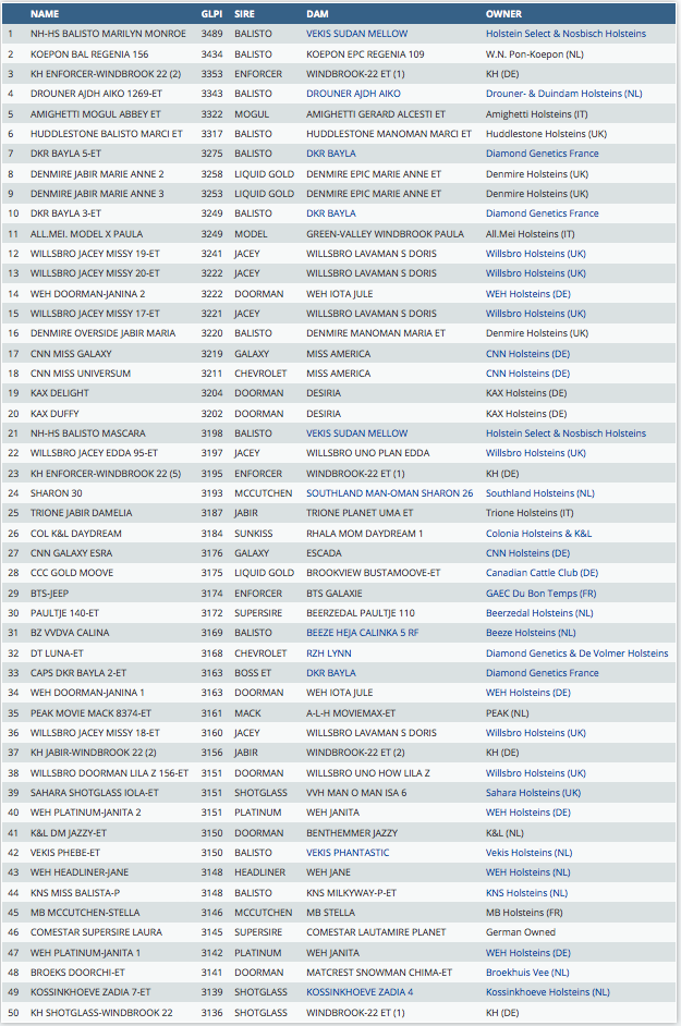 It's the day of the June 2014 indexrun. Click further for the Top 50 of European females for the Canadian GLPI index with NH-HS Balisto Marilyn Monroe on the 1st place (Balisto x Vekis Sudan Mellow). Click further for the complete list.