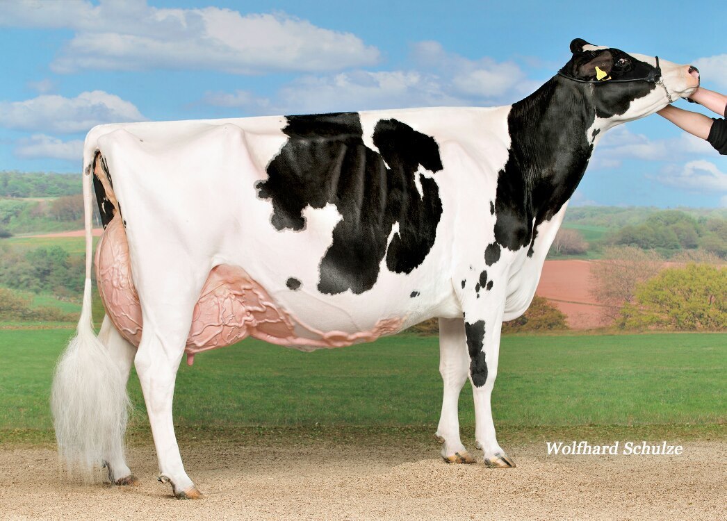 Decrausaz O-Kalibra, the European Champion of 2013 and owned by GS Alliance and Pat Conroy has increased her score up to EX-96-SW! Kalibra is the 2nd Swiss cow ever to score EX-96 in Switzerland! In 2013 she won Grand at the Swiss Expo and the European Championship! Last week her 1st Choice Armani dtr sold for $ 46.500 at an American sale. Kalibra is a Red Carrier Boss Iron dtr from the Canadian Cloverlands Cherry cow family.