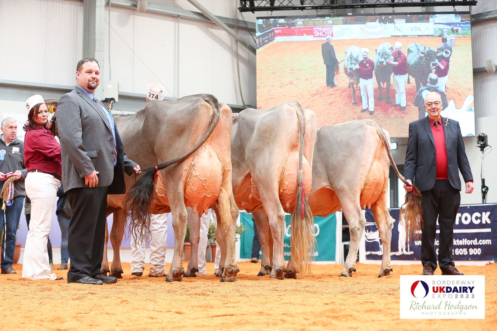 Kedar Brown Swiss and their crew had a fantastic Show last Saturday at the UK Dairy Expo 2023, where they were unbeaten in the ring with Kedar Rhapunzel EX-95-UK. She is the well known Genox-Boy daughter out of Kedar Rhapsody EX-95-UK 2E who crowned Sr. Champion and later on the day named Grand Champion! Her herd-mate Kedar Snickerlicious EX-94-UK is crowned as Reserve Grand Champion of the show. Snickerlicious became 1st in her class with the Jr. Cow in Milk class, followed by again a hermate: Kedar Wonderment Rhappuccino VG-88-UK 2yr. She is a Wonderment daughter also straight out of Kedar Rhapsody EX-95-UK!