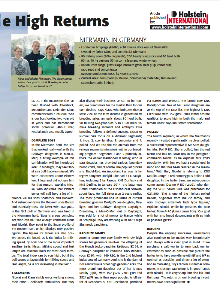 KNS Holsteins from the Niermann family in Germany (Osnabrück region) is a well known name in the breeding business. They have been extremely successful in the past years with high returns on their investments! Read the complete article about KNS Holsteins from the Holstein International May 2014 edition.
