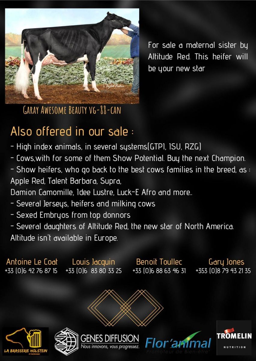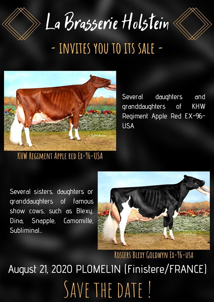 Put the date in your agenda: 21. August 2020! La Brasserie Holstein invites you to it's great sale at the end of August in Plomelin, France. They will offer several daughters and grand daughters of the impressive cow & many favourites: KWH Regiment Apple-Red EX-96, several sisters, daughters or grand daughters to the most famous show cows abroad such as: Rossiers Blexy Goldwyn, Co-Vale Dempsey Dina, Miss Apple Snapple-Red, Silvermaple Damion Camomile, Blondin Goldwyn Subliminal & many more. Furthermore the sale has a wide range with high index heifers in several systems like GTPI, RZG & ISU, fresh cows with show potential, JERSEYS, FEMALE embryos and many more is waiting for you August 21!