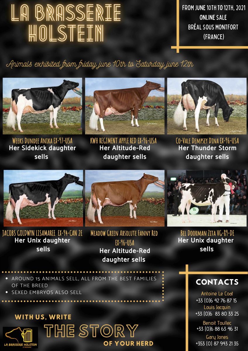 The next edition of the La Brasserie Holstein Sale will be held June 10 - 12, 2021 as an Online Sale. Definitely a sale to mark in your agenda! Where in the world can you find direct daughters of cows like KHW Regiment Apple EX-96, Weeks Dundee Anika EX-97, Co-Vale Dempsey Dina EX-96, Jacobs Goldwyn Lisamaree EX-94 and Meadow Green Absolute Fanny-Red EX-96 sell! Around 15 heifers will sell from the best families in the breed, either FEMALE embryos are selling. Like the slogan of La Brasserie Holstein: 'With us, write the story of your herd'.