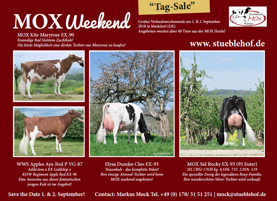 Mox-Holsteins is having a Tag-Sale on September 1st-2nd in 2018! With more than 40 animals for sale out of the best cows of the MOX herd! Some of the great opportunities that will be sold are, the only Atwood daughter that will be sold during this weekend is an Atwood straight out of Elysa Dundee Cleo EX-93-DE! Or what about the great Silver daughter out of the great MOX Sid Rocky EX-93-DE EX-95-MS!! This Silver daughter traces back to the ‘Queen of the Breed’ Glenridge Citation Roxy EX-97-USA! Another great opportunity left for the R&W lover is to buy yourself the last R&W daughter out of MOX Kite Maryrose EX-90-CH!