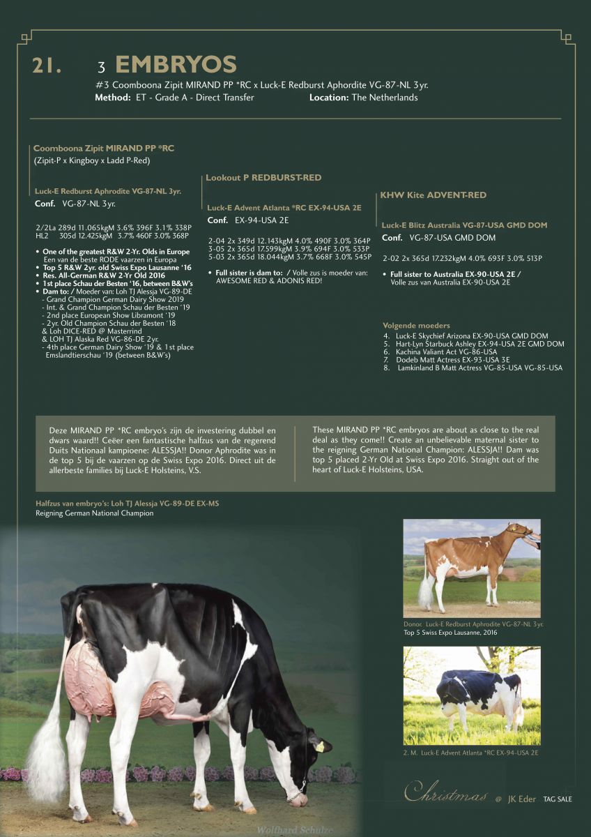 The super transmitting Luck-E Redburst Aphrodite VG-87-NL 3yr. scores again with delivering an amazing R&W Diamondback *RC daughter in Germany: Loh TJ Diamondback Alaska VG-87-DE La2. Aphrodite is dam to the reigning German National Champion: Loh TJ Alessja VG-89-DE EX-MS and the heavily used R&W SHOW sire: Loh DICE-RED @ Masterrind. Her dam is the extraordinary Luck-E Advent Atlanta *RC EX-94-USA, full sister to Luck-E Advent Asia *RC - dam to: AWESOME-RED, ADONIS-RED and Luck-E McGucci Afro EX-93-USA. Aphrodite has been very successful in the show ring as well with being Reserve All-German R&W 2-Yr Old 2016, Top 5 R&W Swiss Expo Lausanne '16 and 1st place 2-Yr Old class Schau der Besten '16 between B&W. Directly from this extraordinary cows are Mirand PP *RC embryos selling in the CHRISTMAS @ JK Eder TAG+ Sale!