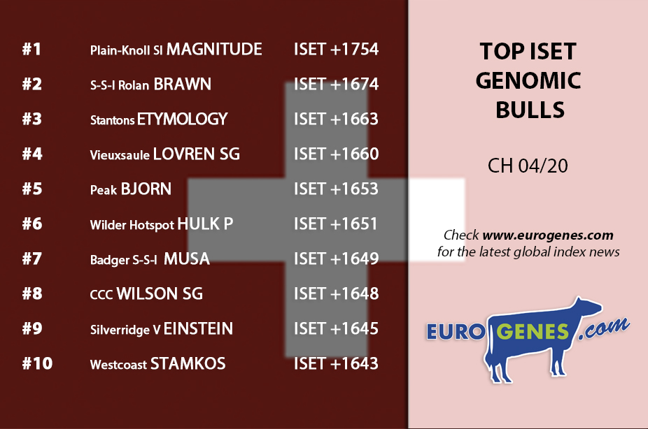 He came out as the #1 ISET sire in Switzerland: Plain-Knoll SI MAGNITUDE at +1754 ISET. Far ahead of the second one in the ISET genomic bulls list: S-S-I Rolan BRAWN at +1674 ISET. The former #1 Stantons ETHYMOLOGY loses two places and drops to the third place at +1663 ISET. The #1 daugher proven sier is Bomaz ALTATOPSHOT with 145 in production at +1532 ISET. Aot Silver HELIX follows in second at +1522 ISET and 538 milking daughters. The #1 ISET heifer is this run Riveting daughter Soppensteig Riveting Arina at +1700 ISET, with 13 points less follows Villstar Hotspot Liss Z at +1687 ISET enough for the second place. Hokovit Solitair Redrose PP came out as the #1 RED & POLLED heifer in Switzerland with +1524 ISET.