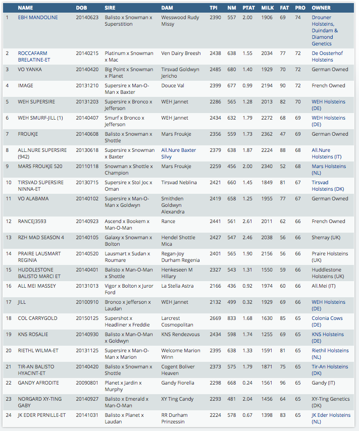 EBH Mandoline from Drouner Holsteins, Duindam Holsteins and Diamond Genetics is the #1 lbs Protein heifer in Europe, she is out of the Wesswood Rudy Missy cow family, as well she is one of the highest heifers in the German RZG system with RZG 159 and also an incredible 159 for the German production index RZM. Mandoline was purchased through the German Masters Sale, also the #2 lbs Protein heifer in Europe sold through this sale, Roccafarm Brelatine with 72 lbs Protein, she is out of the Barbie cow family! Click further for the complete ranking of all European heifers >65 lbs protein!