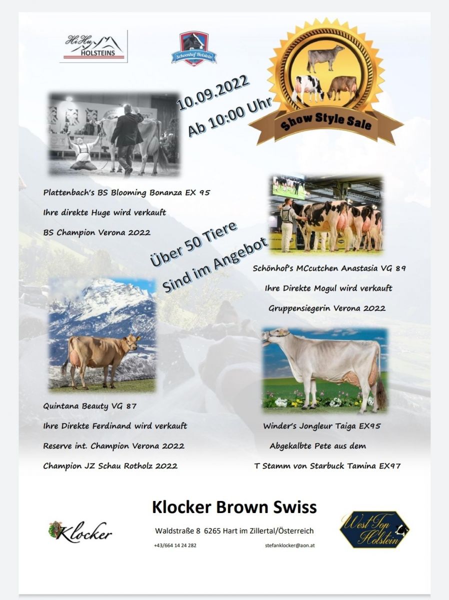 Mark your calendars: Saturday September the 10th, the Show Style Sale 2022. This great sale will be co-organized by Schönhof Holstein from Austria and offers the very best type and show heifers Europe has to offer! With for example: a Mogul heifer out of the classwinner Dairy Show Verona 2022 and Grand Champion State Show Salzburg 2022: SCH MC Anastasia VG-89-AT, a Jeff heifer out of EBS Alesi EX-92, a Dempsey daughter from the Reserve Grand Champion Australian National show 2014: Stel Damion Debat EX-92-AT and many more!