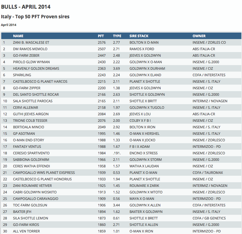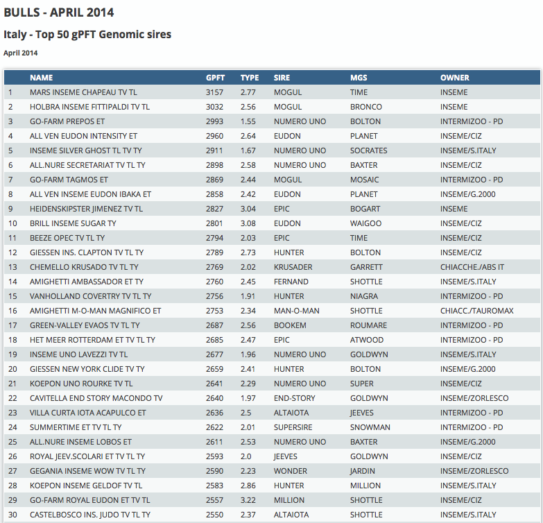 Chapeau has kept his #1 position in the Italian indexrun with a gPFT of +3157 and +2.77 for type. Chapeau is bred by Eurogenes member Mars Holsteins and goes back on the great Froukje cow family. Holbra Holsteins managed to breed the #2 GPFT bull with Holbra Inseme Fittipaldi. He is a son by Mogul, has GPFT +3032 / 2.56 type and is from the American Ralma Juror Faith family. Click further for the top 50 GPFT and PFT bulls from Italy.
