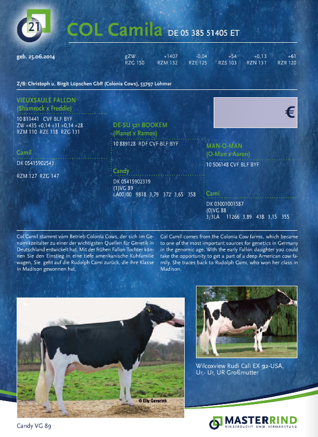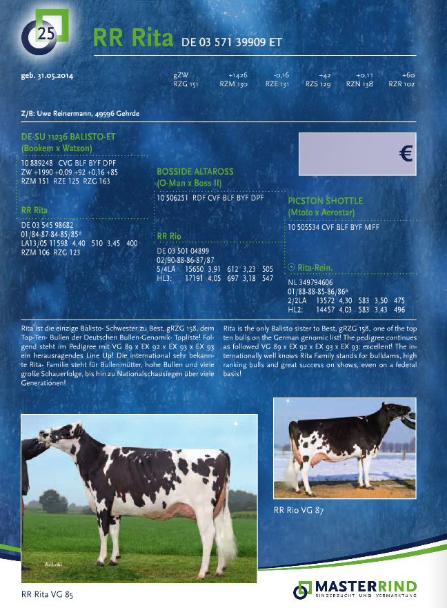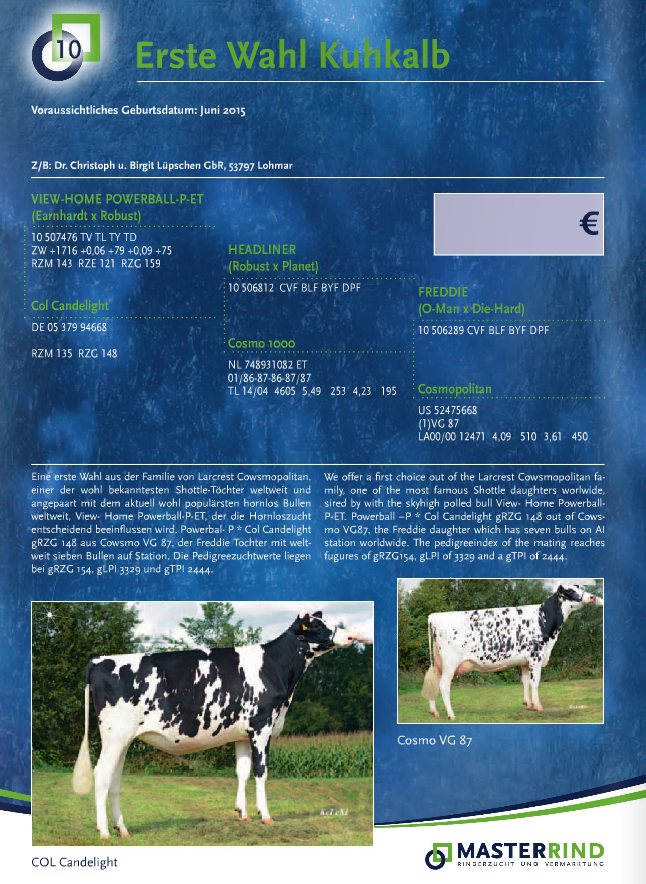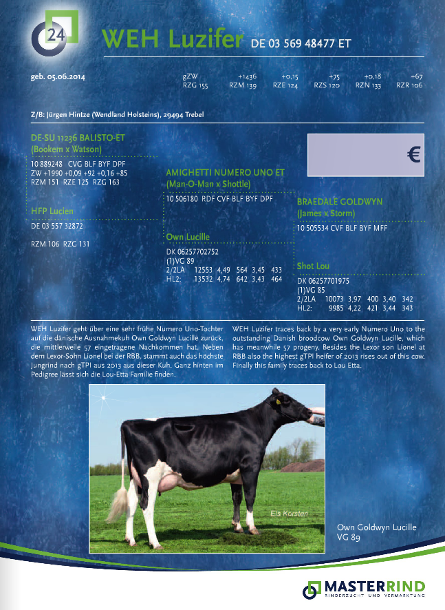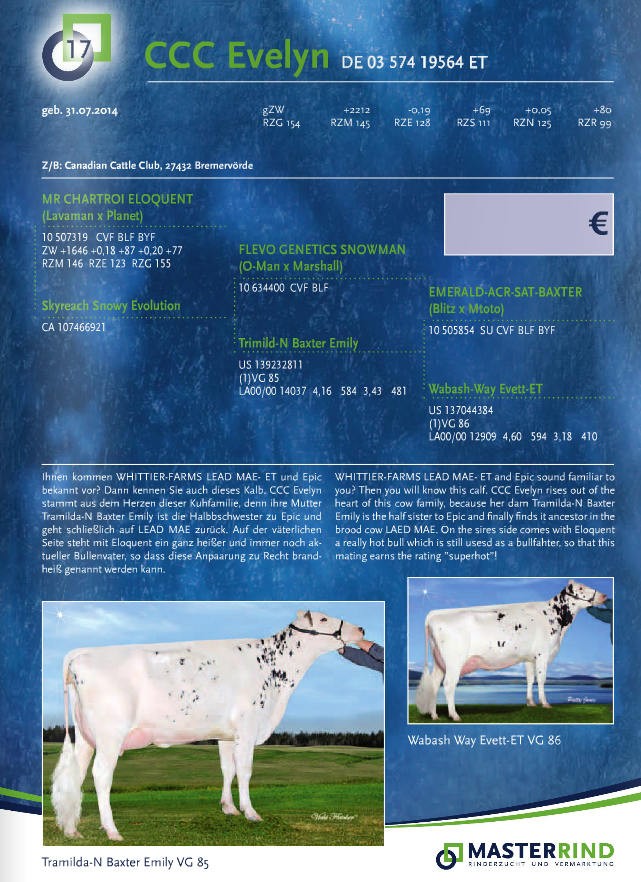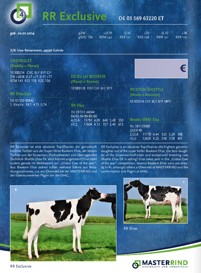 The Masterrind Opportunity Sale will held on Thursday October the 30th in Oldenburg, Germany. Some interesting lots from Eurogenes members are selling, like an RZG 156 Chevrolet from the Elsa family from Reinermann, a 1st Choice Powerball P from the Cosmopolitan cow family from Colonia Cows, an Eloquent grand dtr of Tramilda-N Baxter Emily from the Canadian Cattle Club and more!