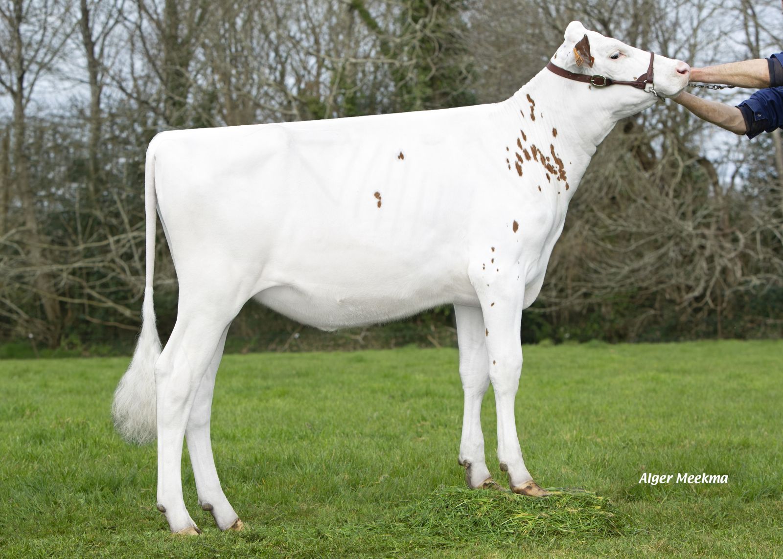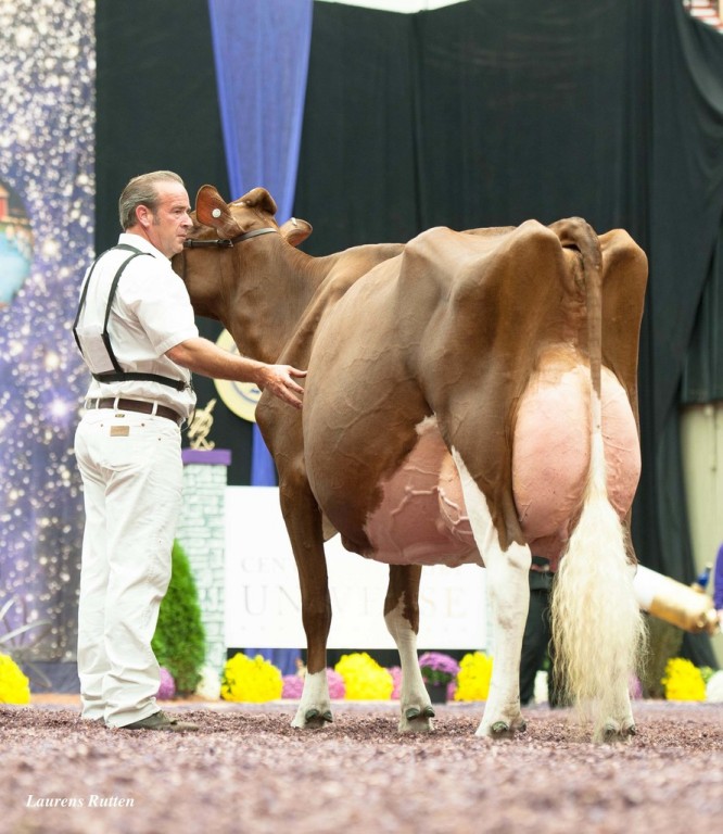 The rare Mirand PP *RC daughter JB Toullec Aria P-Red has been pictured at La Brasserie Holstein. She is the unoffcial number 1 R&W Polled PTAT female at +3.26 PTAT. She combines this with a great Canadian index at +11 Mammary System and +10 Feet & Legs. This brings her to a Excellent score of +13 Conformation. Aria P has 7 generations Excellent dams in her pedigree and is great-grand daughter to the ‘One Million Dollar cow’ APPLE. JB Toullec Aria her dam LB Andorra Red is former #1 R&W PTAT Female in Europe. Aria has also the looks, She is a very long and tall heifer with open ribs, definitely one to take an eye on in the near future!