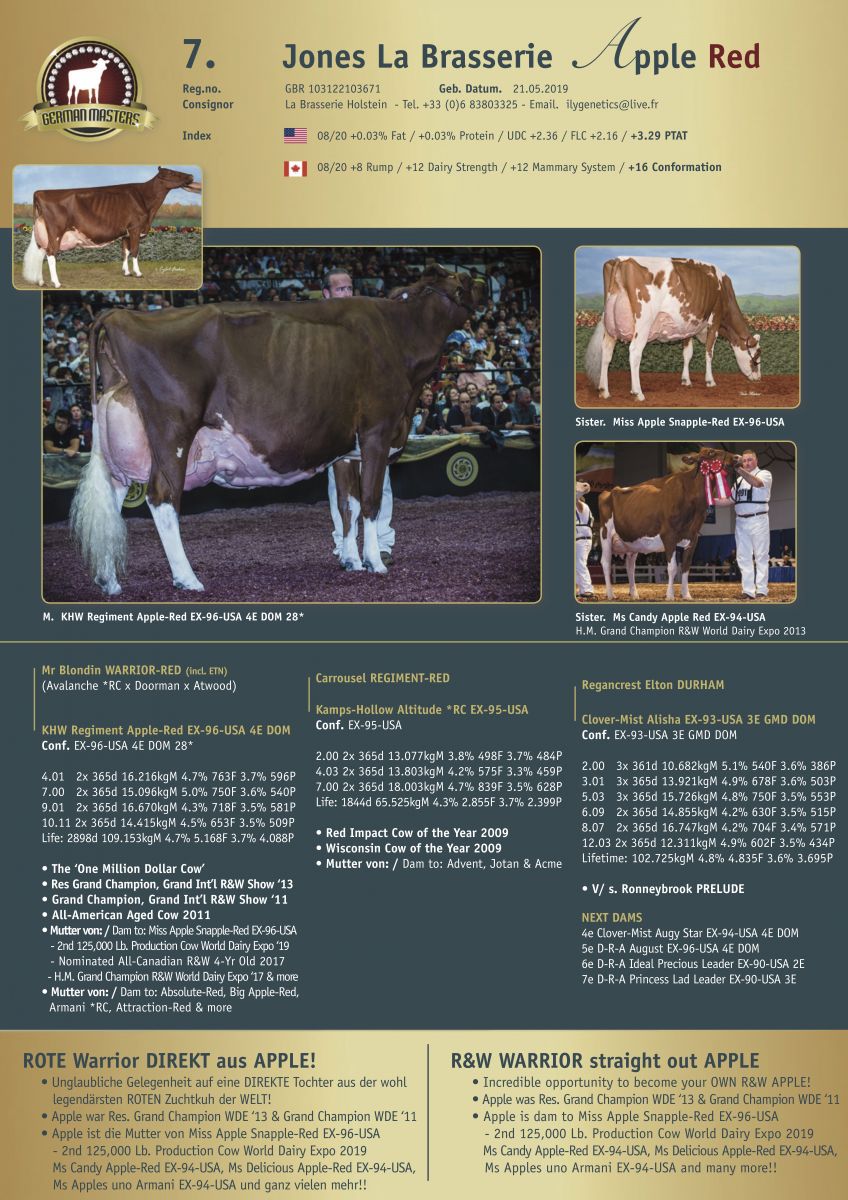 The latest EX-96 Apple descendant Miss Apple Snapple-Red EX-96-USA won her class at the Wisconsin Summer Red & White Championship Show earlier in September. This great Redburst daughter directly from the 'one million dollar cow' KHW Regiment Apple-Red EX-96-USA 4E 28* DOM herself was 1st Production Cow and is getting better every single lactation!! This heck of a cow her Red & White Warrior-Red sisters sells as lot 7 in the German Masters Sale - ONLINE TAG+ Sale next Friday October the 16th.