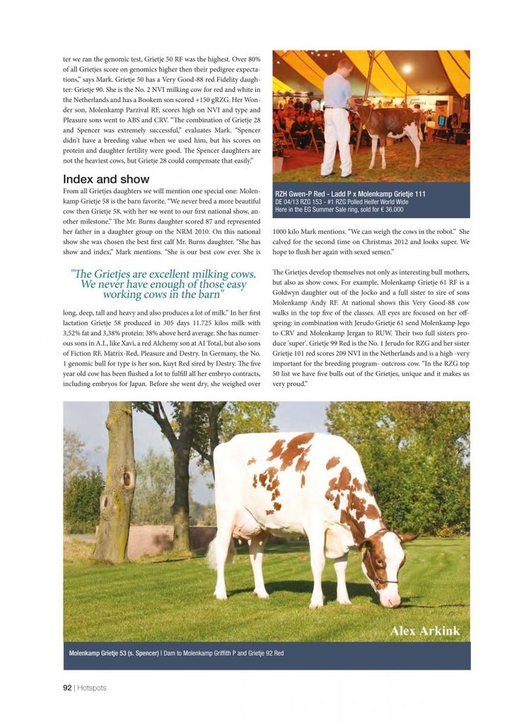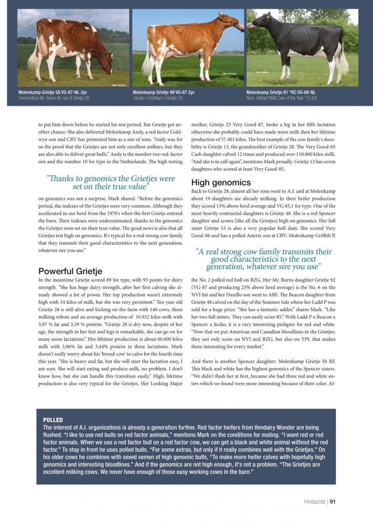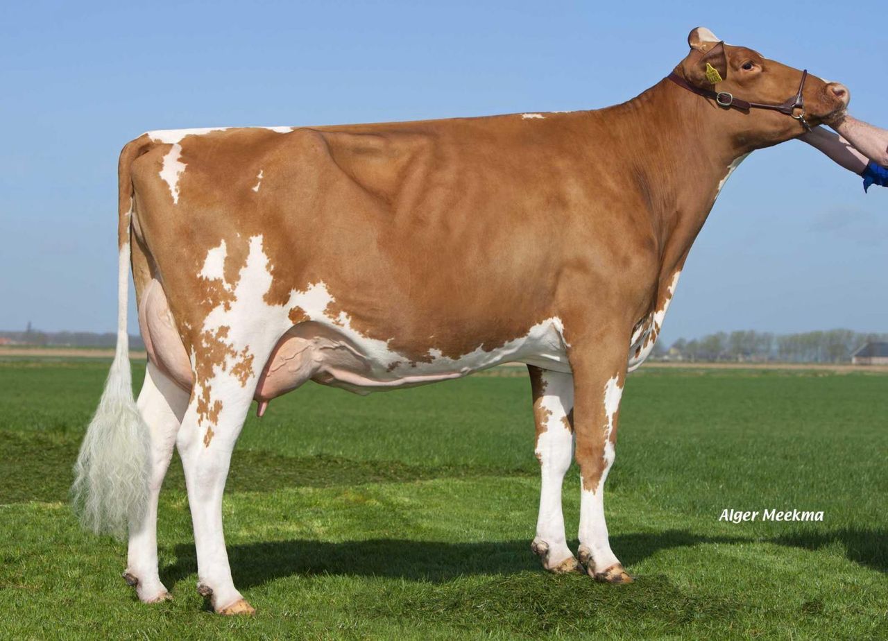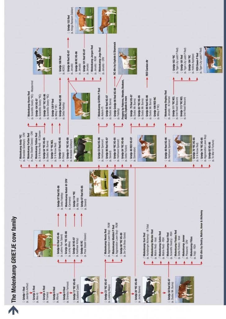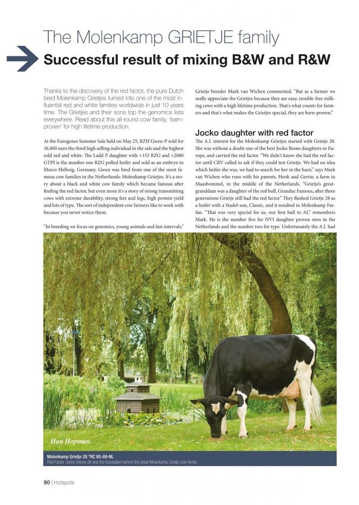 Thanks to the discovery of the Red Factor and high genomics, the Dutch home bred Molenkamp Grietjes proved to be one of the most influential Red & White cow families World Wide in just 10 years! The Grietjes and their sons continiously top the genomic lists in Europe. During the Eurogenes Summer Sale RZH Gwen-RED-P, she was sold as an embryo to Germany, now  sold as a calf for €36.000! She stands at  +153 gRZG and the is #1 RZG Polled heifer World Wide. She goes straight back to  the Red Carrier foundation cow Molenkamp Grietje 13*RC VG-85-NL. Thanks to Genomics the Grietjes are now at the fore front! This family also  delivered the #2 Red Carrier bull & the #5 R&W Proven bull in the Netherlands and Sire of Sons such as Mr Kuyt, the #1 R&W Type bull in Germany & Griffith P, the #5 R&W & Polled bull on NVI base. Click further for the Hotspots article about the Molenkamp Grietjes.