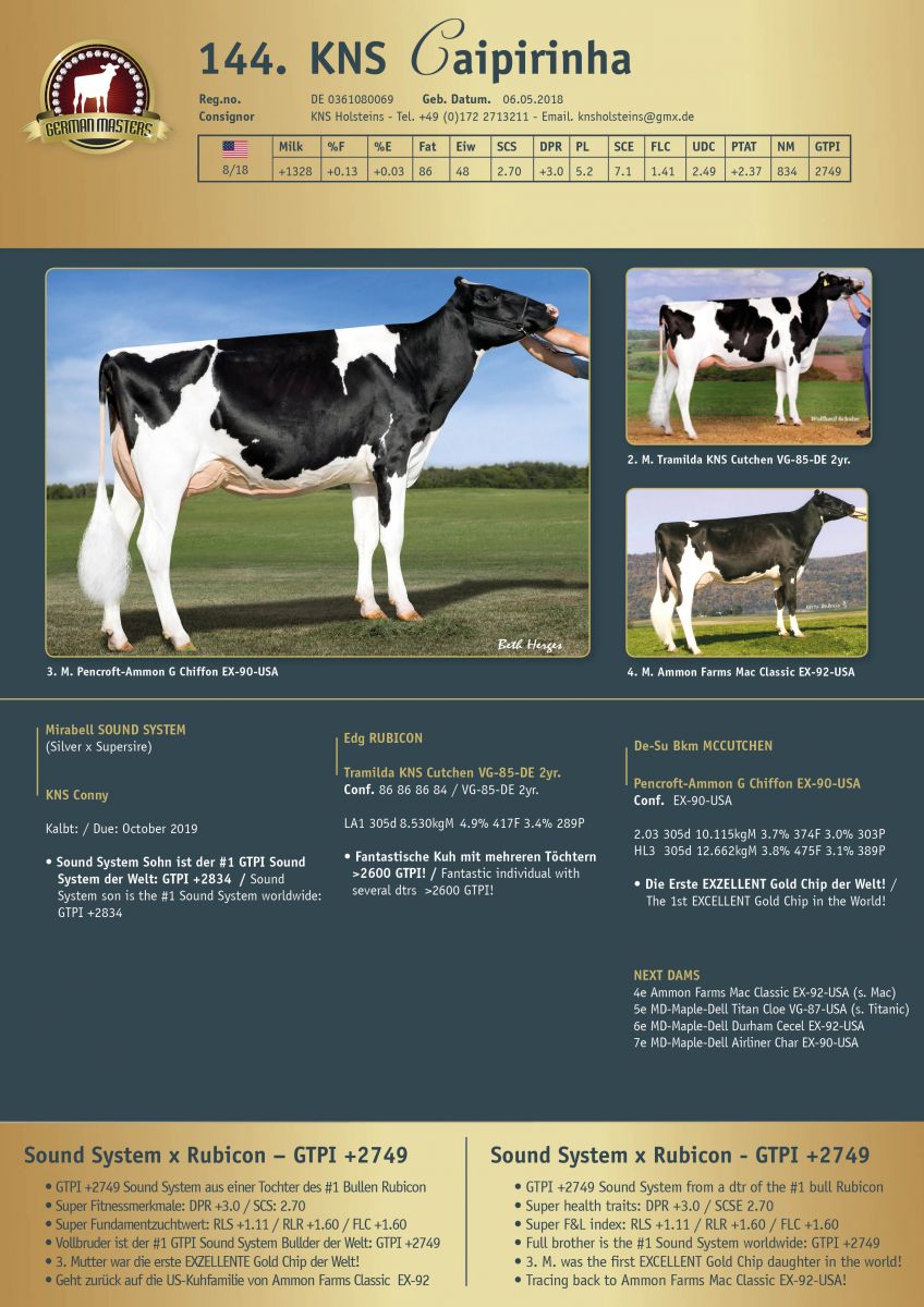 Lot 144 in the German Masters Sale sells in absentee - a movie of this high genomic Sound System dtr is online now right here! A May '18 Sound System x Rubicon with great qualities in her index: +0.13% Fat / SCS 2.72 / DPR +2.9 / SCE 7.1 / Teat Length +0.41 / UDC +2.47 / FLC +1.37 / PTAT +2.36 / GTPI +2744! Her full brother is the highest Sound System son in the World for GTPI (GTPI +2834). They are from a very deep American cow family with 4 EXCELLENT cows in her pedigree! Click further to see a movie of this heifer.