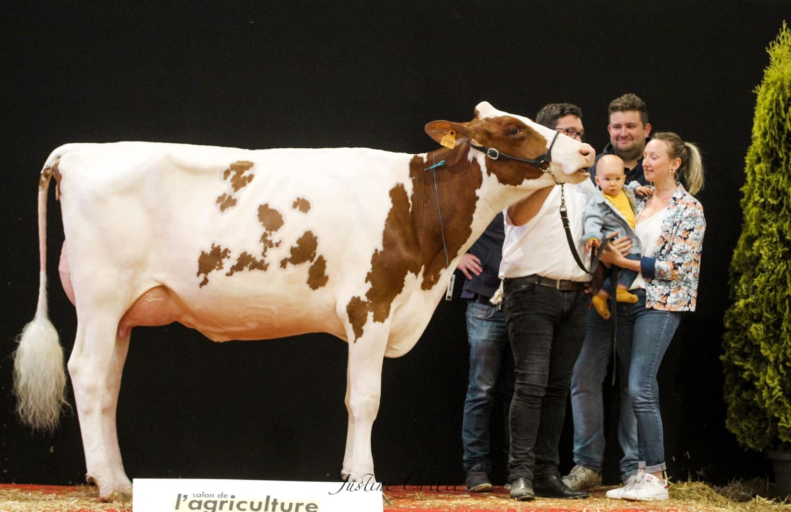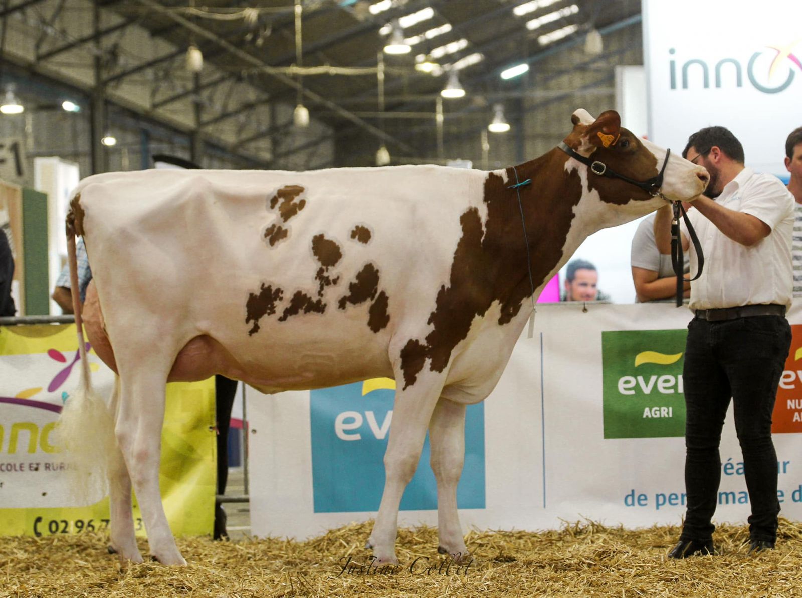 MS Dancer Red is the new Reserve 2yr. old Champion at the Britany Regional Show 2022 between the Black & Whites! The amazing 2yr. old is owned by La Brasserie Holstein. She is sired by Jordy-Red out of MS D Angel Denisha *RC EX-94-USA. Doorman daughter Denisha is not a stranger at the shows, she was Grand Champion & Best Udder at the Wisconsin District 1 Holsteins Show 2020. She is out of Ms Apples Angel *RC EX-94-USA 2E, a Damion daughter who is the maternal sister to several famous cows like, Miss Apple Snapple EX-96, Ms Candy Apple-Red EX-94, MS Delicious Apple-Red EX-94 and Miss Apple Aria-Red EX-95. She is out of the 'one million dollar cow' : KHW Regiment Apple-Red EX-96-USA 4E DOM. The Regiment daughter has a huge influence in the Holstein industry! She was Grand Champion R&W World Dairy Expo 2011, Grand Champion R&W World Dairy Expo 2013 and more! MS Dancer Red her daughter sells during the La Brasserie Holstein sale, August the 12th.