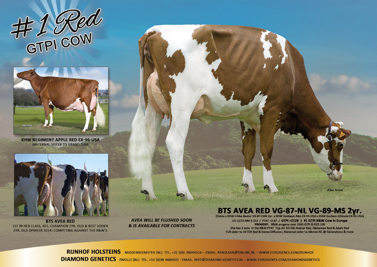 The beautiful R&W heifer R DG Avira Red is the new #1 GTPI R&W heifer in Europe after the October 2014 run --> GTPI +2384!! Avira is an early dtr of Olympian from the current #1 GTPI Red cow in Europe, BTS Avea Red VG-87-NL 89-MS 2yr. which was Res. 2-Yr. Old Champion in Opmeer (Against the B&W's) and is dam to 3 Top 20 PTAT bulls for R&W. Her Fageno dtr R DG Anna Red is the #3 GTPI Red heifer in Europe with GTPI +2295. Detox-daughter Avea is a grand dtr of KWH Goldwyn Aiko EX-91-USA, the maternal sister to Advent, Jotan, Acme & Apple EX-96!