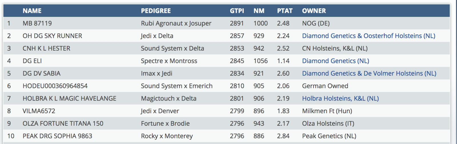 Multiple exciting heifers from global top level has been added in the August '18 run. A great run for Diamond Genetics & partners with 3 heifers in the Top 5 GTPI of new added heifers. The #2 for GTPI in this list is OH DG Sky Runner from de Oosterhof and DG with GTPI +2847 - she is a maternal sister of the #2 RZG bull Soundcloud @ Semex (RZG 164). DG Eli is one of the very few daughters in Europe of De-Su Spectre, she is the new #1 Net Merit heifer in Europe with NM $ 1056, which she combines with GTPI +2845. On the 5th place we find De Volmer Sabine her first daughter DG DV Sabi with GTPI +2834 (full sister to DG DV Simax - GTPI +2871). Note this list contains the NEW heifers added in the August '18 run only. The complete rankings will be online later this week.