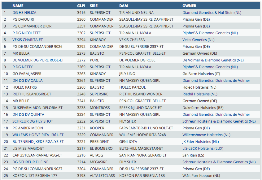 DG HS Neliza is the #1 GLPI heifer in the Canadian April '15 run, this is the list which contains heifers which are new tested for the April '15 run. Neliza is a Supershot dtr with 3416 GLPI out of the Neblina cow family with >2600 GTPI as well! Almost 25% of the heifers of the April '15 Top 50 are sired by Supershot! Click further for the complete list.