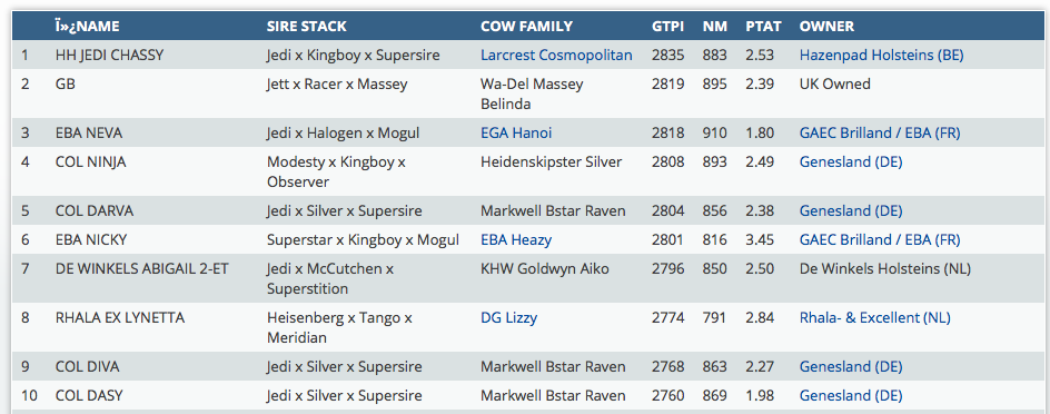 The March '17 run in Europe delivered 6 new heifers in Europe >2800 GTPI, the highest new heifer in Europe this run is HH Jedi Chassy with GTPI +2835 which sells in the Roccafarm Sale on the 7th of April. The Genesland program from Germany delivered 6 heifers in the Top 10 from this run, from which 2 >2800 GTPI. Click further for the complete Top 50 of new tested European females from 03/17!