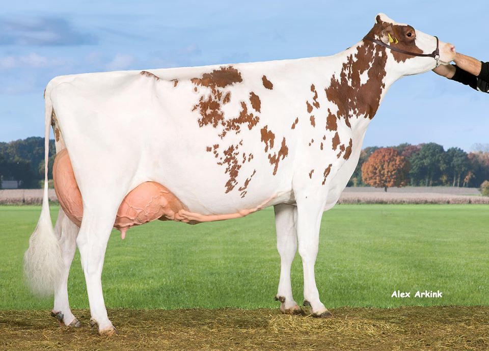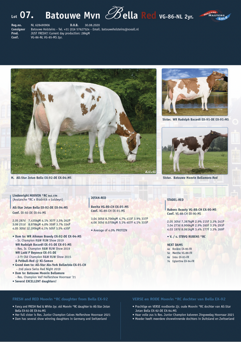 An amazing picture from Batouwe Mvn Bella-Red is made by Alex Arkink last weekend! The FRESH Red&White daughter sired by Moovin *RC is last week classified with VG-86-NL 2yr. with VG-85 for her Mammary system and was last weekend 4th in her class with Jr. 2yr. olds at the Heifershow Hoornaar '22! Her dam is All-Star Jotan Bella EX-92-DE with EX-94 for her outstanding Mammary system! She has multiple daughter who are successful showcows, like: WR Aikman Brandy EX-92-DE EX-94-MS, she was Sr. Champion R&W RUW Show '19 or WR Rudolph Bacardi EX-91-DE EX-91-MS, she was Res. Sr. Champion R&W RUW Show '19. Another successful daughter is WR Ladd P Beyonce EX-91-DE, she was 2yr. old Champion R&W RUW Show '15. Bella EX-92 is also dam to the bull Patbull-Red @ KI-Samen. Batouwe Mvn Bella-Red VG-86-NL 2yr. could be your next showwinner, because she sells today at the Online Holland Masters Sale '22!!