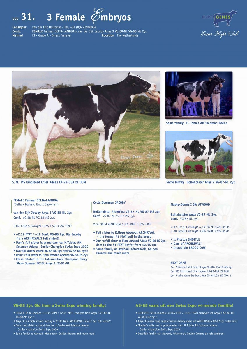 Today we have received a new picture of the show topper backed by the ADEEN'S: van der Eijk Anya 3 VG-88-NL VG-88-MS 2yr. This high scored 2-Yr Old her dam is the full sister to the former #1 PTAT sire in the breed: ARCHRIVAL and scored VG-87-NL as a 2-Yr Old. Dam her full sister is grand dam to the reigning Junior Champion Swiss Expo: H.Tobias AM Solomon Adena. Anya 3 her FEMALE Farnear DELTA-LAMBDA (+2745 GTPI / +2.61 PTAT) embryos are for sale as lot 31 in the Eurogenes EASTER Heifer Sale this Friday evening. Bid last on this great lot! Click further to read more.