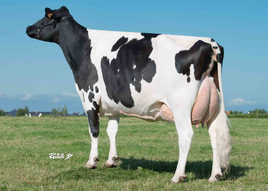 We received the NEW picture of DKR Baella (s. Monterey), she is a daughter of the huge transmitter: DKR Babylone VG-85-FR. Her IMAX son DGF BALOU is in A.I. @ Genes Diffusion and notes a very complete profil with +2771 gTPI/ A2A2/ +3.09 UDC/ 6.3% SCE/ +90 Fat! Baella her dam Babylone is the dam to the popular bulls Bolt, Brisbane, Bangalore & Baltasar. She also is the maternal sister to Baylaboy & Blacklist @ RSH. Baella her grand dam is the former #1 RZG cow in the World: DKR Bayla VG-86-NL. She deliverd several chart topping offsprings in several systems: GTPI, RZG & NVI. Bayla her dam is the former #1 GTPI cow in the World: Baviere VG-87-FR EX-MS. This Shottle daughter deliverd Jakarta @ Semex & Bossanova @ Masterrind. A great cow family which goes back on Sunnylodge Prelude Spottie VG-87-CAN 18*!! DKR Baella is a young promising cow with no less than 12 generations VG or EXCELLENT dams in a predigree!