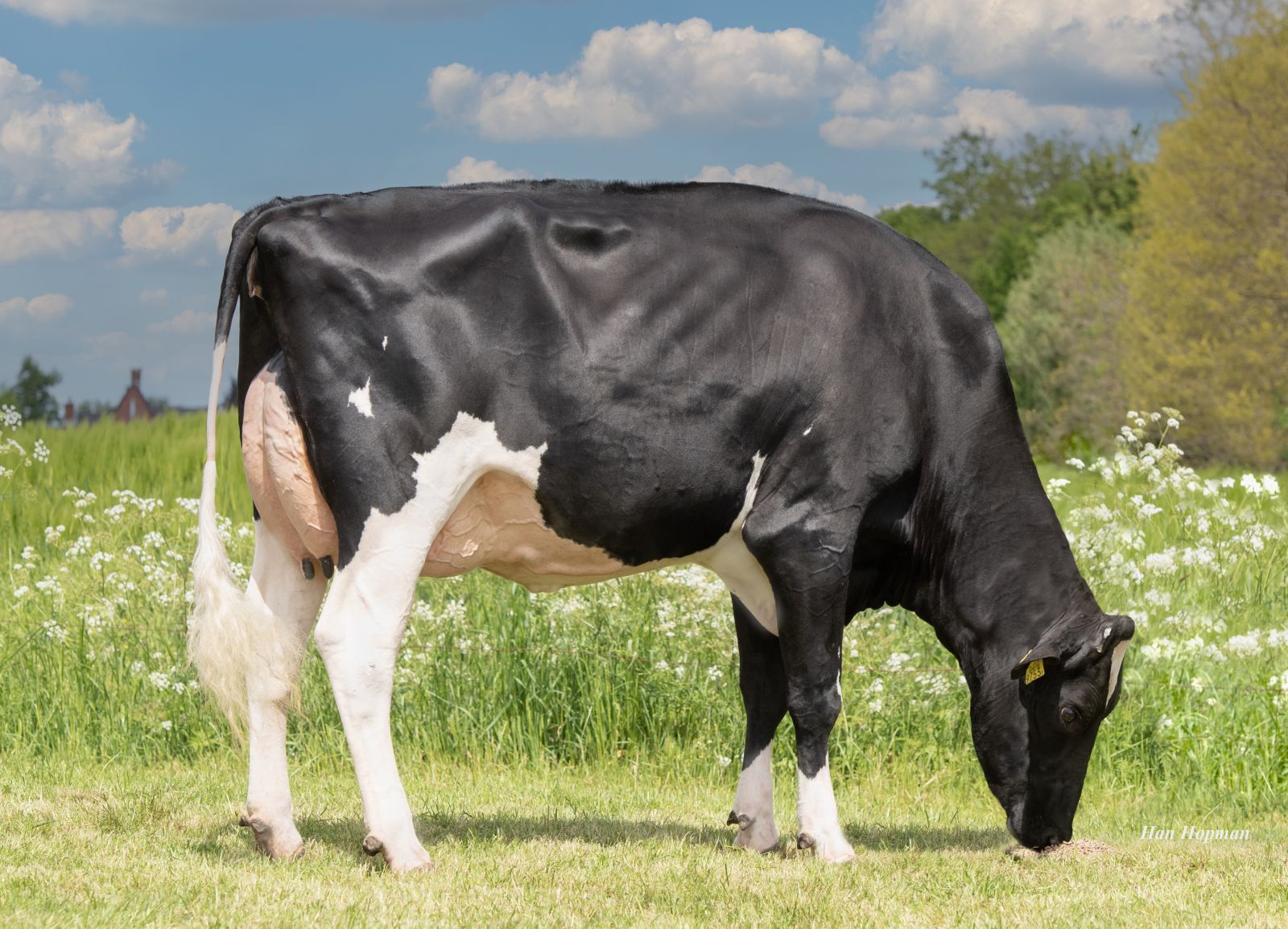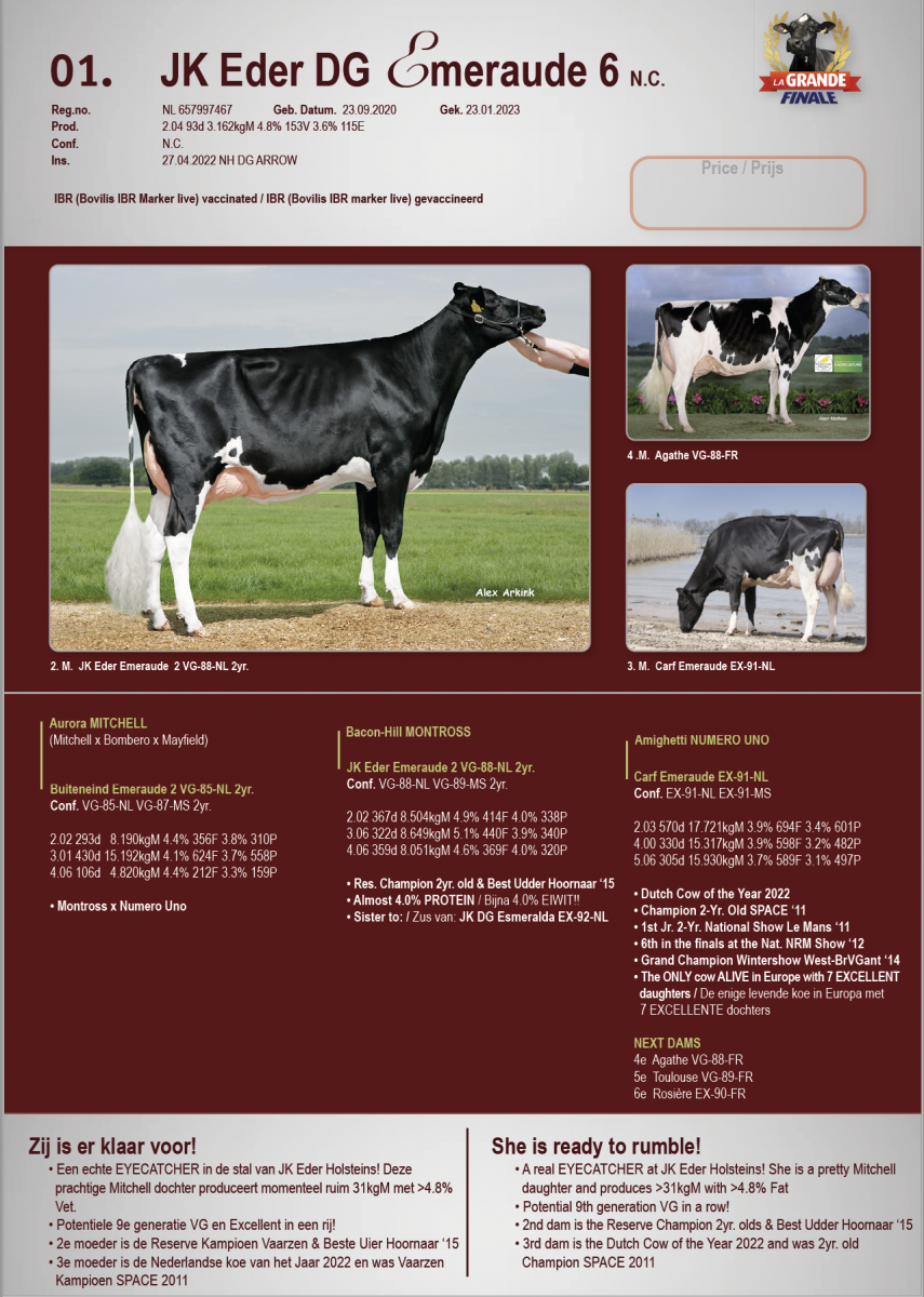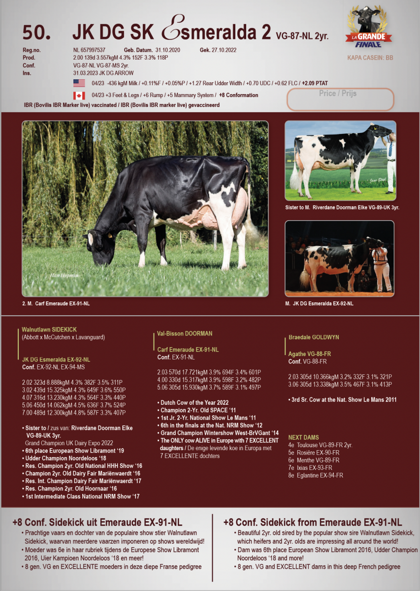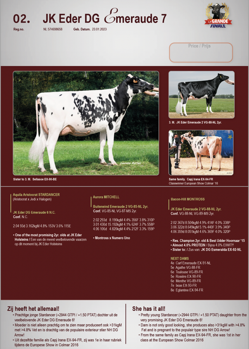 Last week visited Han Hopman JK Eder Holsteins in the Netherlands for taking pictures of 2 very promising 2yr. olds! These 2yr. olds are selling at the La Grande Finale at Saturday June the 17th 2023 and are from the well-known Carf Emeraude EX-91-NL cow family! One of these 2yr. olds is JK Eder DG Emeraude 6. She is a Mitchell daughter from Buiteneind Emeraude 2 VG-85-NL 2yr. (s. Montross) out of JK Eder Emeraude 2 VG-88-NL 2yr. This silky black Numero Uno daughter was Reserve Champion 2yr. old & Best Udder Hoornaar show 2018. Her dam is the Dutch cow of the Year 2022 and 2yr. old Champion SPACE show 2011: Carf Emeraude EX-91-NL. JK Eder DG Emeraude 6 isn't classified yet, but will be an easy 'Very Good' 2yr. old. She and her Stardancer daughter are selling at the La Grande Finale as Lot 1 & Lot 2! Another 2yr. old from the Carf Emeraude EX-91-NL cow family and who is pictured is Lot 50. JK DG Sidekick Esmeralda 2 VG-87-NL 2yr.! She is a +2.09 PTAT / +8 Conformation Sidekick daughter straight out of the multiple showwinner: JK DG Esmeralda EX-92-NL EX-94-MS! Esmeralda EX-92 is a successful Doorman daughter and is the full sister to Riverdane Doorman Elke EX-93-UK, she was Grand Champion UK Dairy Expo 2022 and is straight out of Carf Emeraude EX-91-NL!