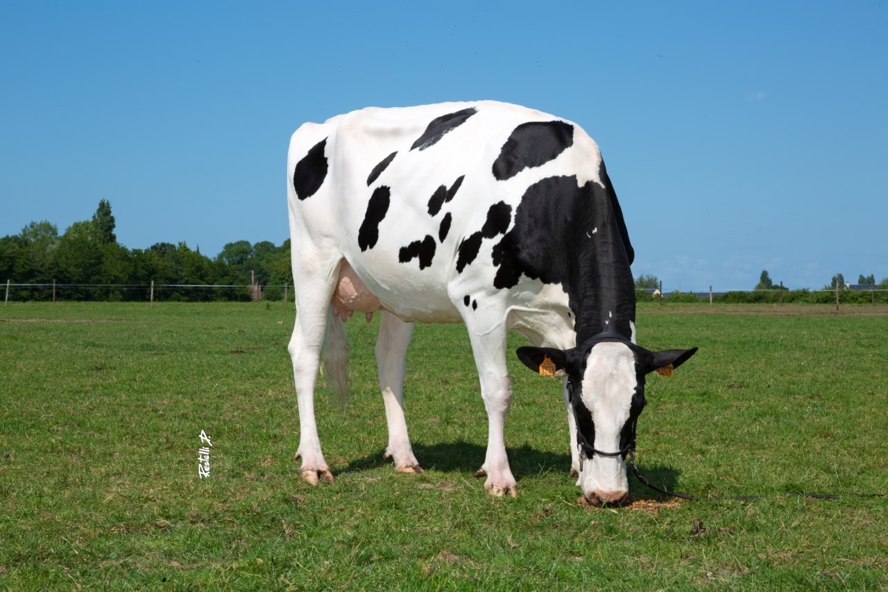 The stunning View-Home Monterey daughter of the top transmitter DKR Babylone VG-85-FR 3yr. has been pictured two days ago!! The result is absolutely stunning, her progeny is up to +2690 GTPI which the legacy of this family continues. DKR Babylone goes back on a VG-86-NL 2yr. Garrett dam followed by Baviere VG-87-FR EX-MS - the former #1 GTPI cow in the WORLD - and then backed by the Sunnylodge Prelude Spottie VG-87-CAN 18* family. This huge cow family also produced the Grand Champion Schau der Besten 2020: Fux Seattle and offers the complete package.