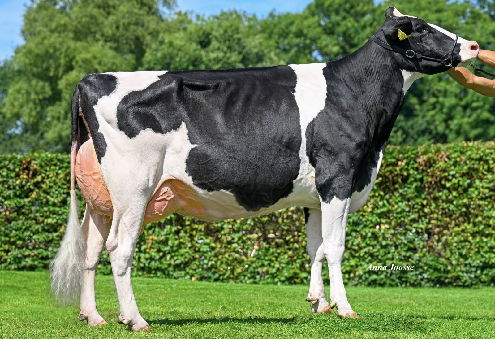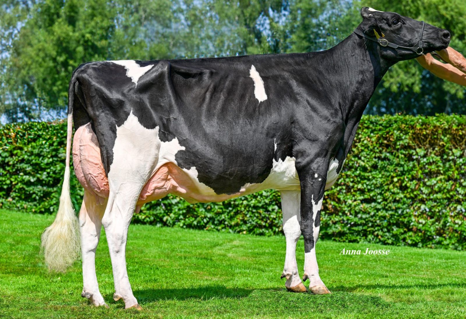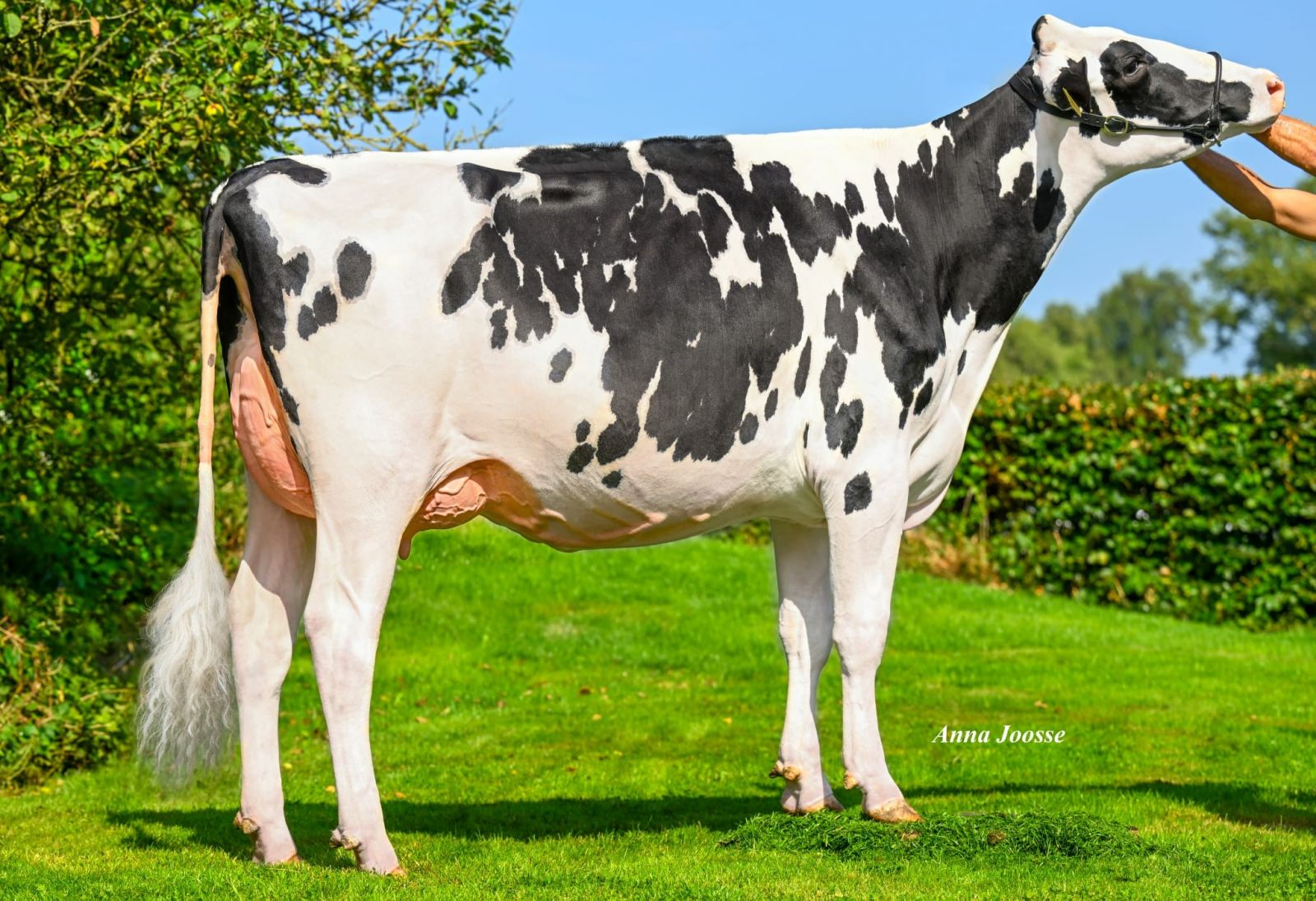 The show toppers of the show string from New Moore Holsteins are a few months ago pictured at the Rundvee Show Noord in Lhee, the Netherlands. New Moore Side Maria 510 VG-89-NL was crowned as Grand Champion of the show after she won her class that day. Her barnmate, New Moore A342 Dina 389 followed her in 2nd with winning Reserve Intermediate Champion. New Moore Tatoo Dina 395 (Tatoo x Fitz x Ked Juror) won the youngest class with 2yr. olds at the Summer show and the 2yr. old Champion ribbon. She is a few weeks later classified with the maximum score for a 2yr. old with VG-89 with VG-89 for her tremendous Mammary System and VG-88 for her Feet & Legs. She goes back to the home-bred Dina cow family.