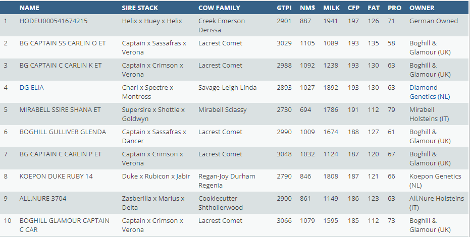 Today it's time for a great new ranking on combined FAT and PROTEIN (CFP) based on the GTPI index! We will introduce you the top 10 combined FAT and PROTEIN females in Europe of the August 2021 proof. Genosource Captain has a lot of influence in the list with daughters in the top 10. The number 1 CFP female is a Helix daughter with +197 CFP. Three heifers shared a second place, BG Captain SS Carlin O (s. Captain) with +193 CFP from the Lacrest Comet Family. She shared the second place with BG Captain C Carlin K, a Captain daughter with also +193 CFP. And a shared second spot for Charl daughter DG Elia from the Savage-Leigh Linda Family with also +193 CFP.