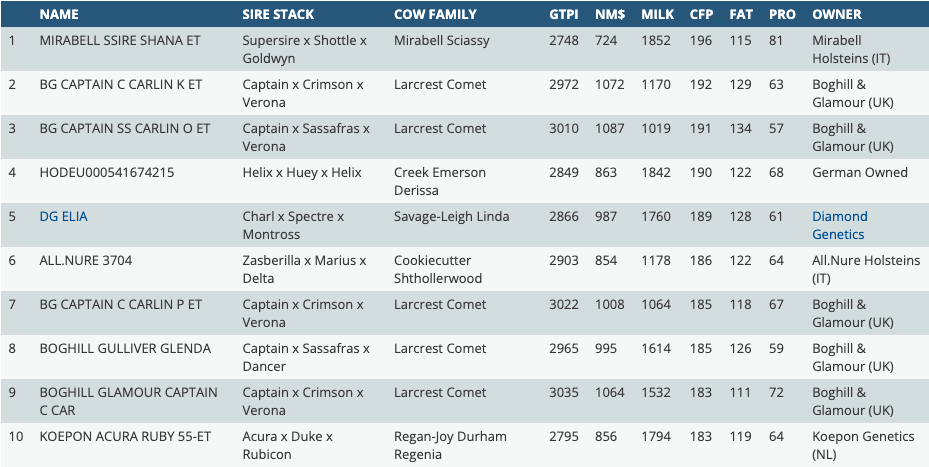 Today it's time for a new ranking on combined FAT and PROTEIN (CFP) based on the GTPI index! We will introduce you the top 10 combined FAT and PROTEIN females in Europe of the December 2021 proof. Genosource Captain has a lot of influence in the list with daughters in the top 10. The number 1 CFP female is a Supersire daughter with +196 CFP from Italy. On the second spot we find a Captain daughter with +192 CFP. Making the top three complete is a again a Captain daughter from the Larcrest Comet family with +191 CFP. On the fifth spot we find DG Elia, a Charl daughter with +189 CFP.