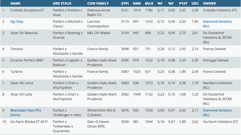 Today an exciting new top ranking with the top 25 Siemers Rengd Parfect daughters in Europe based on the American GTPI index. Siemers Rengd Parfect debuting in the April '23 index run as the #3 GTPI daughter proven sire at +3066 GTPI and +2.71 PTAT with 74 daughters in his index. The #1 GTPI Parfect daughter is Cristella Scorpiona from the Deervue-Acres Robin Cri family at +3121 GTPI and +2.32 PTAT. Also her milkproduction traits are worth to mention: +1782kgM with +0.17% Fat and +0.05% Protein. She is followed by DG Chey at +3115 GTPI and +2.30 PTAT from the Larcrest Cosmopolitan family. Making the Top 3 complete with a grand daughter to K&L OH Mabel at +3109 GTPI. Furthermore at the 9th spot we find the Topseller of the German Masters Sale 2022: Beerzedal HiPo Pfct Emma at +3076 GTPI and +2.45 PTAT with +2.17 UDC!