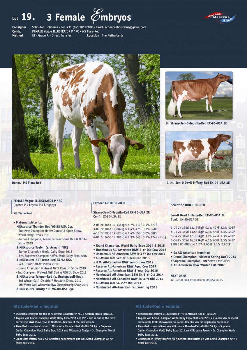 She is a great Red & White showheifer from one of the best RED show cows of the past decade. Schouten Holsteins ownes an ALTITUDE-RED (not available in Europe) daughter straight out the Grand Champion World Dairy Expo 2014 & 2015: Strans-Jen-D-Tequila-Red EX-96-USA. From this stunning heifer are FEMALE Vogue Illustrator P *RC (+2.88 PTAT / +12 Conf.) embryos selling in the Online Holland Masters Sale. Her maternal sisters by Unstopabull-Red & Armani *RC were SUPREME Junior Champion World Dairy Expo 2019 and Junior Champion (B&W) World Dairy Expo 2018. Tequila is one of the most successful R&W show cows in Nortern-America with 6x All-American nominees, Grand Champion MN State Holstein Show '13, Grand Champion WI Spring R&W Show 2017, Grand Champion Midwest R&W Spring Show 2016 and many more. Her dam Jen-D Devil Tiffany-Red EX-95-USA 3E was Supreme Champion @ MN State Fair 2007 and has no less than 9x All-American nominees.