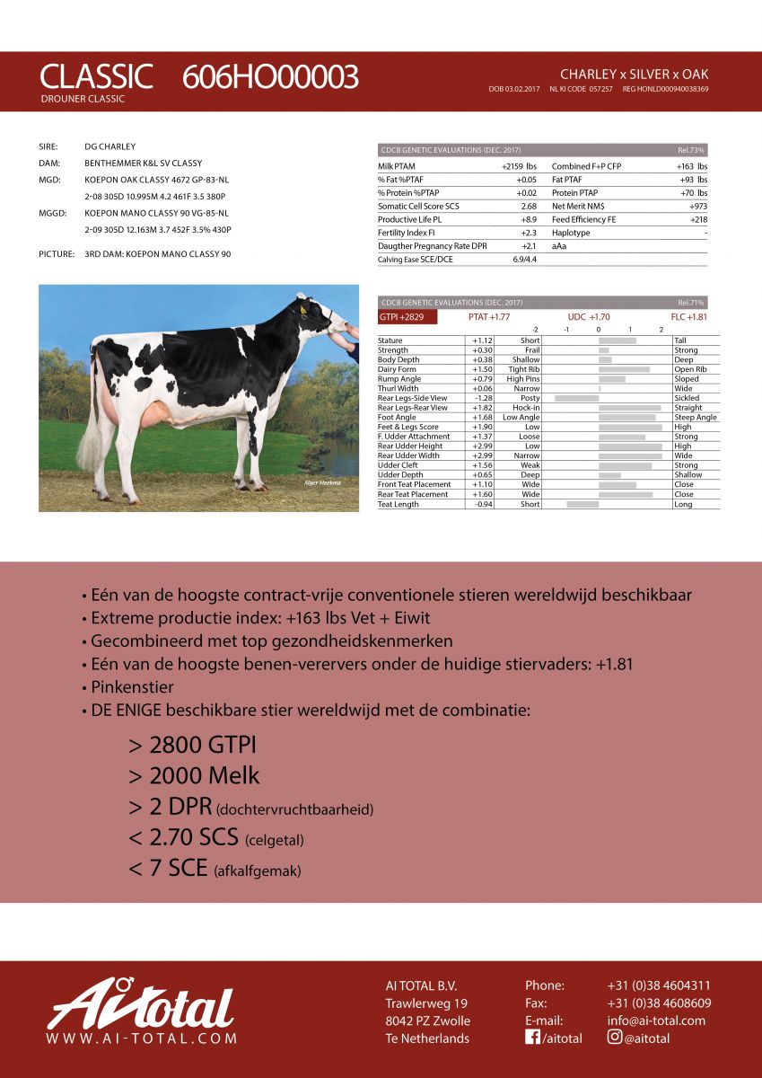 As from Feb 15 on, Classic semen is available. Next to 2829 TTPI with a fantastic profile he stands out for milk (+2159) combined with a plus for components. SCS, PL and DPR indexes are very favourable and he is +1.71 UDC and +1.81 FLC. Classic also sires a slight slope to the rump (+0.79). Classic is free of all known haplotypes.