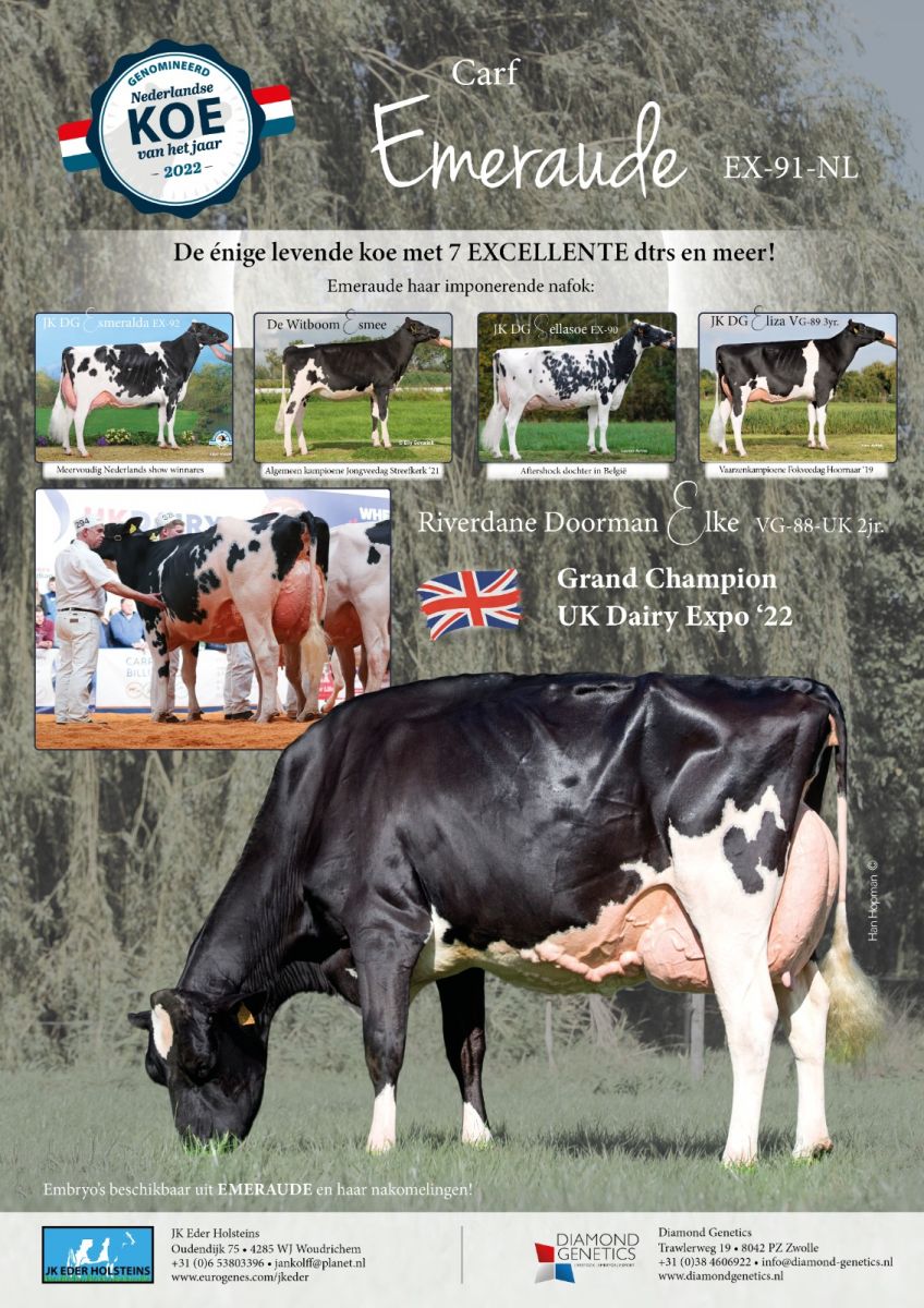The 2yr. old Champion, Udder Champion and Grand Champion Wintershow Middenmeer 2022 raised her score yesterday to the phenominal VG-89-NL as 2yr. old. She one of the hottest cows at the moment: JK Eder DG Carmen 5. The Dylan daughter is bred by JK Eder Holsteins and Diamond Genetics and is sold as maiden heifer to Van der Eijk Holsteins. Her dam is JK Eder DG Carmen 2 VG-85-NL VG-87-MS 2yr. She is a Solomon granddaughter from JK DG Esmeralda EX-92-NL EX-94-MS. Esmeralda became 6th in her class at the European Show in Libramont '19, 1st Intermediate 2yr. old National NRM-show '17, Res. Champion 2yr. old Dairy Fair Mariënwaerdt '16, Champion 2yr. old Dairy Fair Mariënwardt '16 and more. Doorman daughter JK DG Esmeralda EX-92-NL EX-94-MS is out of the nominee Dutch Cow of the year 2022: Carf Emeraude EX-91-NL. Emeraude is from a French pedigree with a lot bull dams and showwinners. Emeraude developed at JK Eder Holsteins into a true broodcow with six EXCELLENT daughters in 4 different countries.