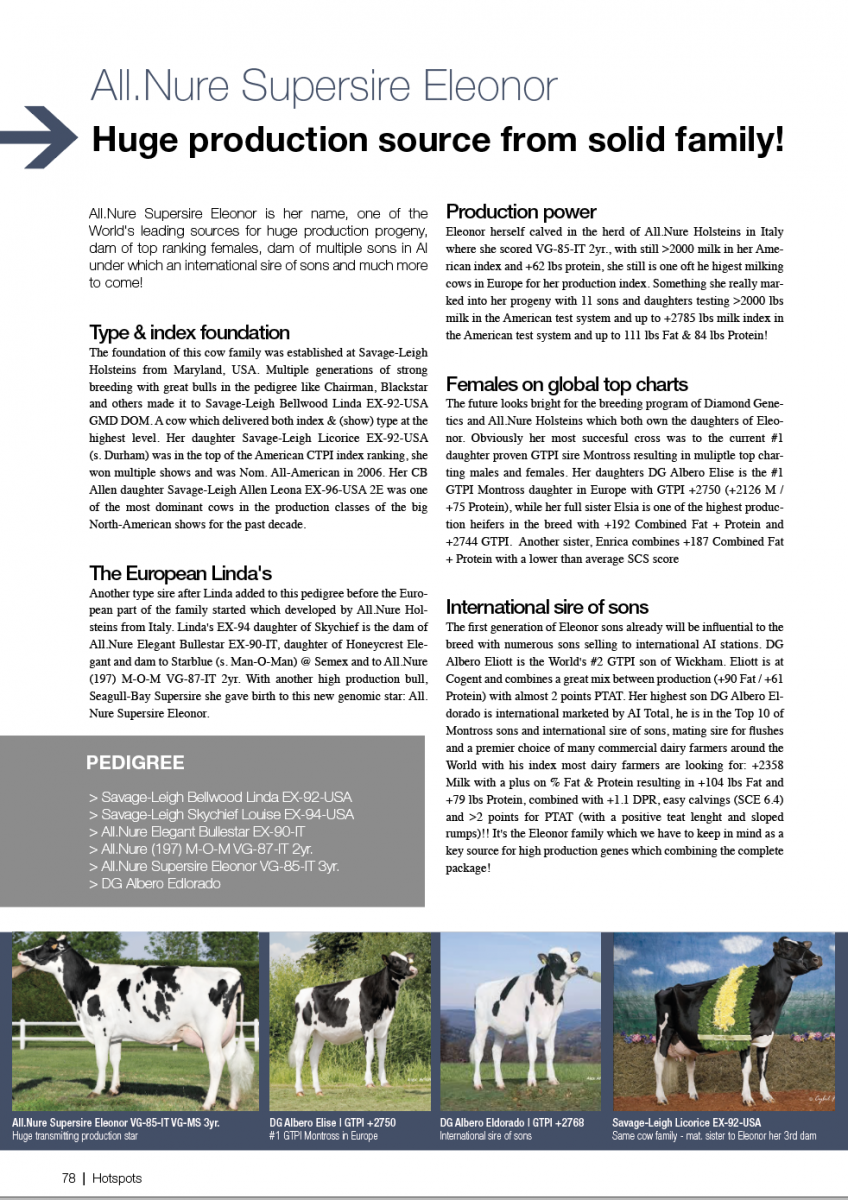 The first daughters of DG Albero Enrica has hit the ground, the genomics which came back on them are putting her offspring in the global top charts, her Pledge daughter Evita is the World's #1 Pledge daughter with GTPI +2833 (NM $ 955), she also delivered the World's #4 Pledge- & Europe's #2 Exactly daughters! Enrica is a full sister to the popular sire Eldorado @ AI Total (GTPI +2744), going back on the high class brood cow Savage-Leigh Bellwood Linda. Read more about her high offspring and for a full article about this cow family!