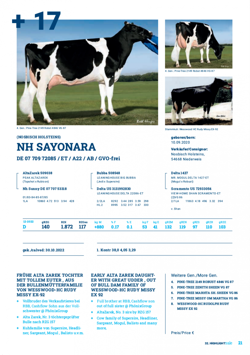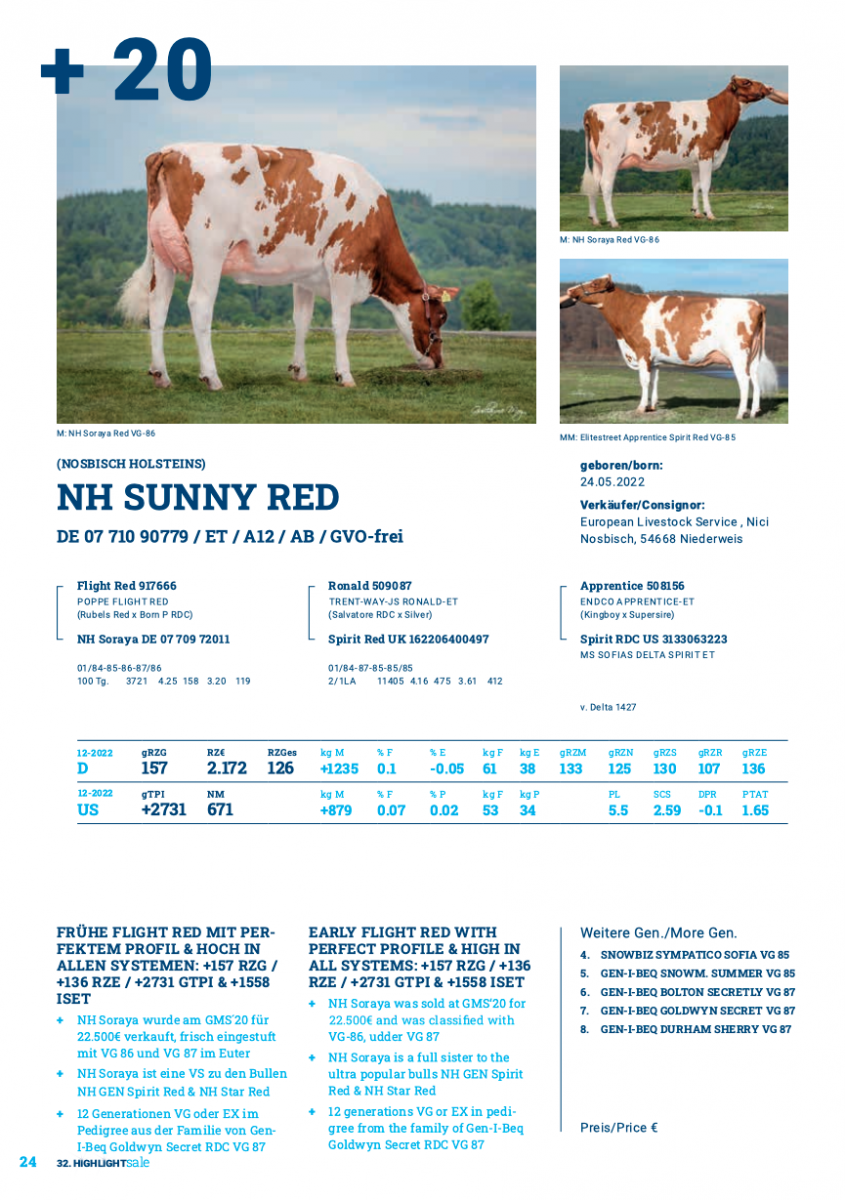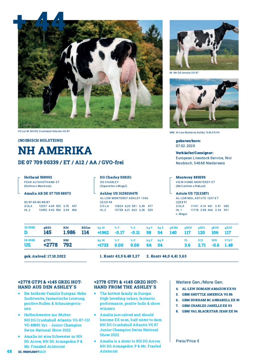 The 32. Highlight Sale '23 is taking place on January the 6th in Hamm (DE)! Nosbisch Holsteins has consigned the very best for this sale, starting at 07.30 p.m. (German Time). Nosbisch Holsteins offers a fancy and early 2yr. old AltaZarek daughter as Lot 17: NH Sayonara! She is 2 months fresh now and produces >38kgM / day! Her dam is NH Sunny VG-85-DE 2yr., she is a Bubba daughter and has a AltaZarek son at RBB. Another consignment from Nosbisch Holsteins is Lot 20. NH Sunny Red. She is a Flight Red daughter at +157 RZG with +136 RZE (TYPE), +2731 GTPI in combination with +1.65 PTAT and she scores in her Swiss index: +1558 ISET! Her dam is the young and promising NH GL Soraya-Red VG-86-DE VG-87-MS 2yr. She is a Trent-Way-JS Ronald *RC daughter and sister to the populair sires NH Gen Spirit-Red @Ai-Total and NH Star Red @Ascol. NH GL Soraya-Red VG-86-DE 2yr. was sold as calf for 22.500 EUR at the German Masters Sale '20 and is from 11 generations VG or EXCELLENT classified cows. Nosbisch Holsteins offers as Lot 44. NH Amerika! She is a Peak AltaHothand daughter and scores in her German Index +145 RZG and +1962 kgM! In her US-index she scores +2778 GTPI with +1732kgM and +1.48 PTAT. She is 2 months fresh now and produces >44kgM with 3.6% Protein. Her dam is a DG Charley daughter straight out of the tremendous Al-Lew Monterey Ashley EX-94-USA, she is the dam to the populair sires NH DG Arrow, NH DG Armagedon P and Mr. Frazzled Aristocrat!