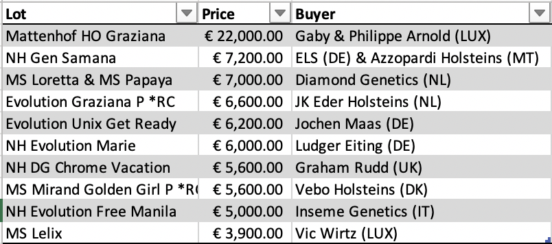 This premiere was very successful with over 500 viewers and over 200 online bidders, who created a huge online crowd with a very lively bid activity right from the start of the sale. All lots and incl. 7 of 8 embryo packages were sold successfully which resulted in a clearance of >95%.