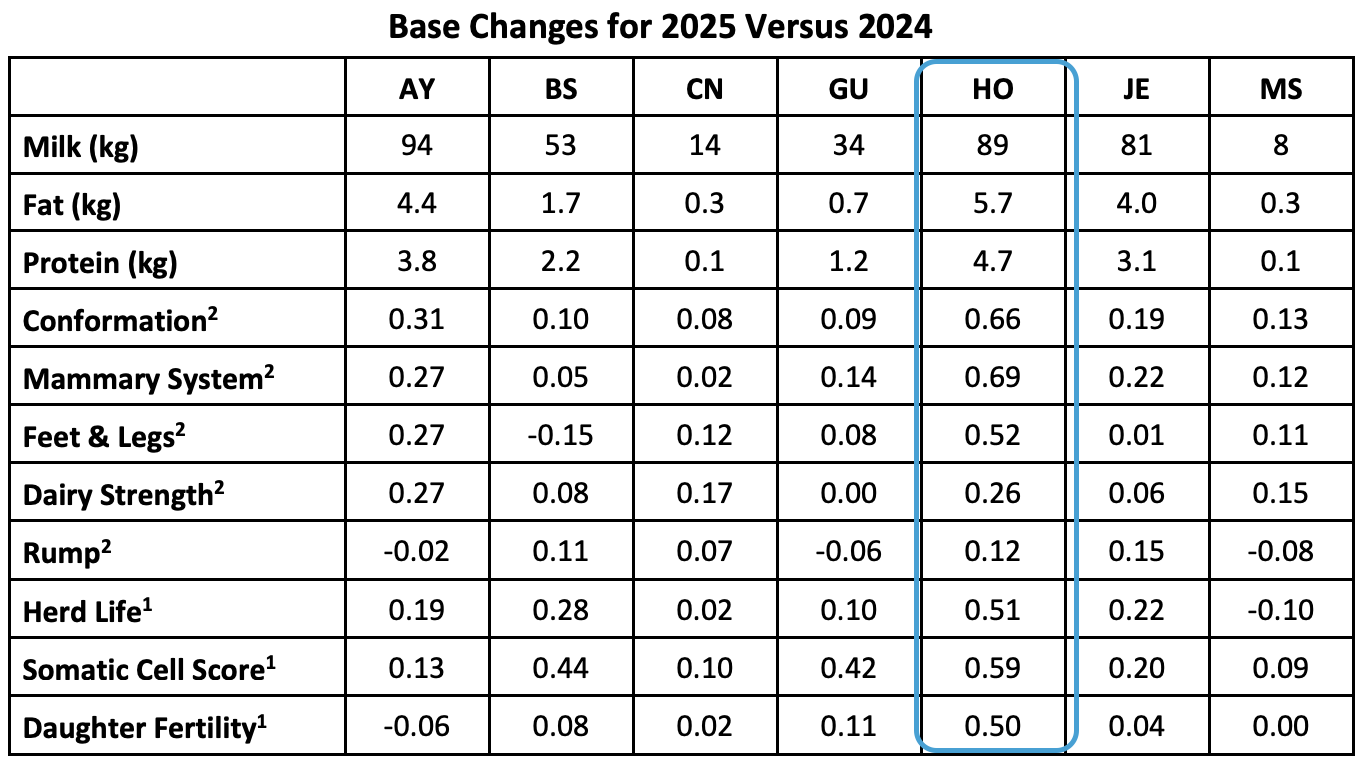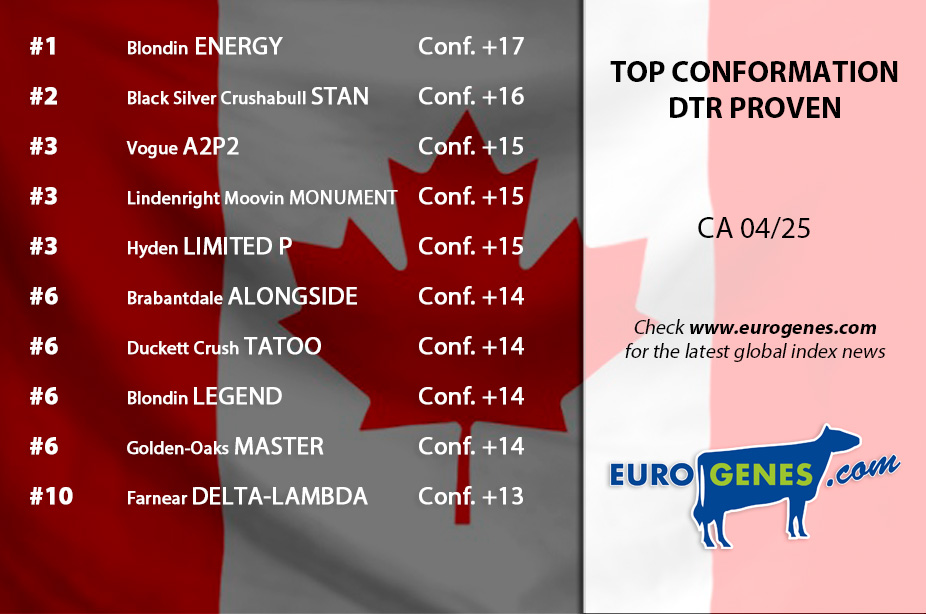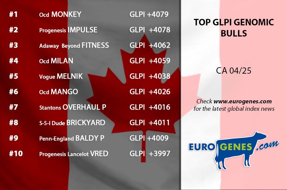 Each year, the genetic base used to express genetic evaluations in Canada is updated in conjunction with the first official release and we don’t really notice a lot of change. We’ll see a drop off 89kg of Milk and 0.66 Conformation. Topping the Canadian LPI index at +4079 gLPI and sired by Claynook Zard: Ocd Monkey. He is followed by Progenesis Impulse at +4078 gLPI and making the stage complete with Adaway Beyond Fitness at +4062 gLPI. The #1 daughter proven LPI sire is S-S-I PR Renegade at +3850 gLPI. At the second spot follows his son Siemers Renegade Rozline at +3827 gLPI. Making the top 3 complete with Redrock Klutch son Genosource Johnboy at +3827 gLPI.
