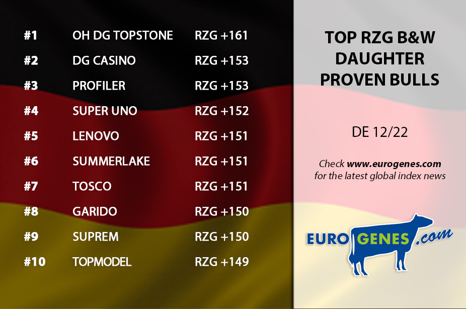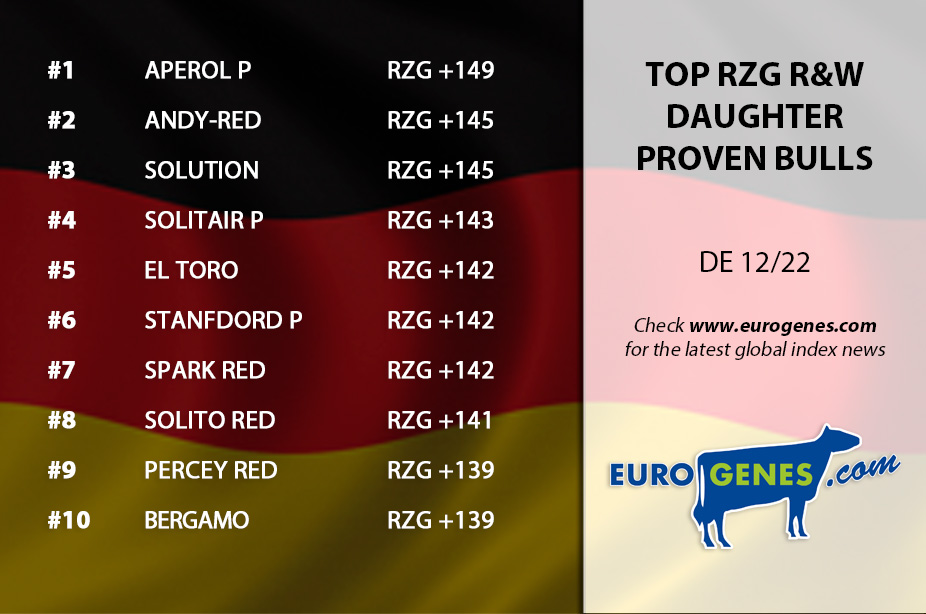A solide December 2022 proof for OH DG Topstone at the 1st place in the RZG B&W Domestic Bull list at +161 RZG. DG Casino still ranks high in the RZG list, he is this run the #2 RZG B&W Domestic Bull at +153 RZG. At the third place we find DG Charley son Summerlake at +151 RZG. In the RZG R&W Daughter proven list is the #1 this run again Aperol P at +149 RZG. He is followed by Bentehoek Andy-Red at +145 RZG, who has a solide proof. Making the Top 3 complete with Mr. Salvatore *RC son Solution at also +145 RZG. Furthermore at the 7th spot we find COL DG Spark-Red, he is a Mr. Salvatore *RC son at +142 RZG. At the 8th spot we find another Mr. Salvatore *RC son: NH Solito Red at +141 RZG. The #1 RZG R&W Domestic sire is De DG OH Rubels-Red at +153 RZG. Bentehoek Andy-Red is the #4 in this list at +145 RZG.