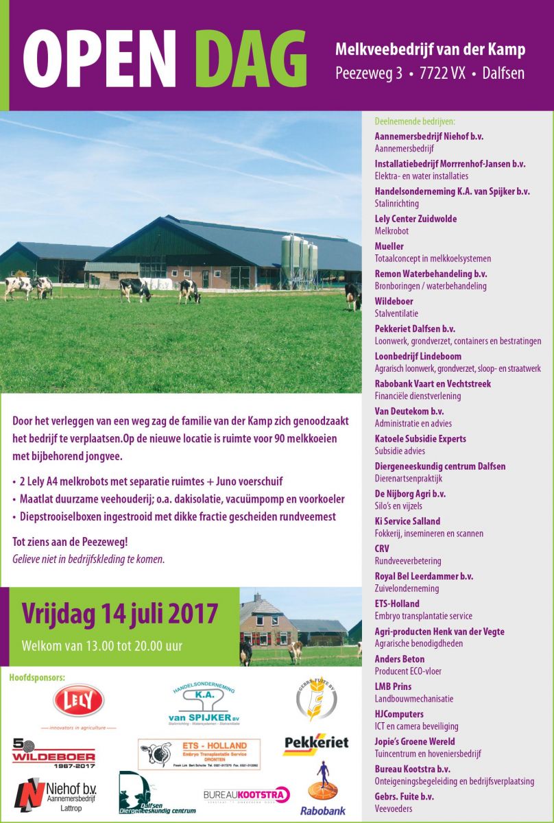 Beeze Holsteins, well known of the Beeze Judys open their doors of their new farm on the 14th of july at 01:00 PM until 20:00 PM. The new farm has space for 90 milking cows which will get milked by 2 Lely A4 milking robots. Click further for the complete invitation.