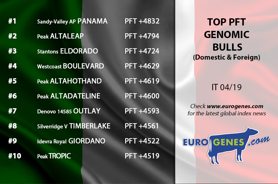 Sandy-Valley AP Panama is the NEW outstanding number 1 in the PFT genomic bulls list (Domestic & foreign bulls). He notes +4832 PFT with a great type score of 2,76 Type!! He is followed by Peak Altaleap (+4794 PFT) and Stantons Eldorado (+4724 PFT). Peak Altaleap is also the number #1 IES Genomic bull in Italy. In the daughter proven PFT list is Altahotrod topping the list with +4129 PFT in combination with an outstanding type score of +3.13!! Altahotrod is closely followed by the #2 Cookiecutter Harper who notes +4109 PFT. Holbra Rodanas has the #7 place in the list with +3735 PFT and also +2,55 for type! Bouw Finder is the #1 IES Dtr proven sire in Italy with 1190 IES!! Followed by the former #1 GTPI Dtr proven sire: Edg Rubicon, who provides +1178 IES with +3941 PFT.