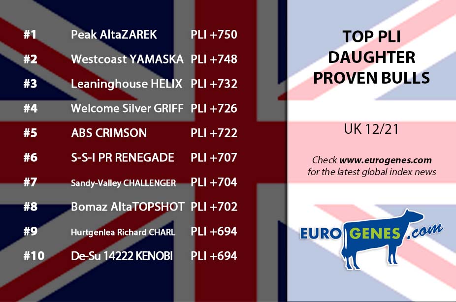Peak Breaking News is the number #1 PLI young genomic bull with +957 PLI. The number #2 young genomic bull is Genosource Captain, he was the former #1 PLI in the UK. Captain has this proof +944 PLI in combination with +1.40 TM! The #1 TYPE MERIT genomic bull in the UK is Peak Tropic son Jimtown Nashville with +3.21 TM! In second follows Bomaz Rimrock with +2.99 TM. On the third place follows Nosbisch Holsteins Solito - Red with +2.87 TM. The number #1 PLI daughter proven bull is Peak AltaZarek A2A2 with +750 PLI in combination with +1.60 TM. The number #1 TYPE MERIT dtr. proven bull is Attico-Red with +3.52 TM!