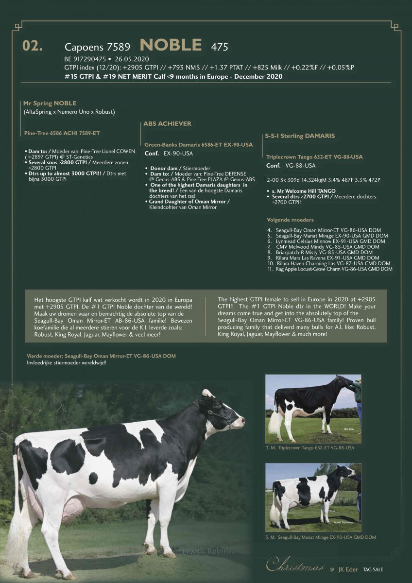 She is the #1 GTPI Calf to sell in Europe this year: Capoens 7589 Noble 475. She tops at +2905 GTPI in combination with +793 NET MERIT $, +1.37 PTAT and great production traits: >800 Milk, +0.22% Fat and +0.05% Protein. This fancy Noble daughter is either to the #1 GTPI Noble in the WORLD, the #15 GTPI and #19 NET MERIT Calf <9 months in Europe - December 2020. Make your dreams come true and get into the absolutely top of the Seagull-Bay Oman Mirror-ET VG-86-USA family! Proven bull producing family that deliverd many bulls for A.I. like: Robust, King Royal, Jaguar, Mayflower & much more! Click further for more info about the Christmas @ JK Eder TAG+ Sale and her picture.