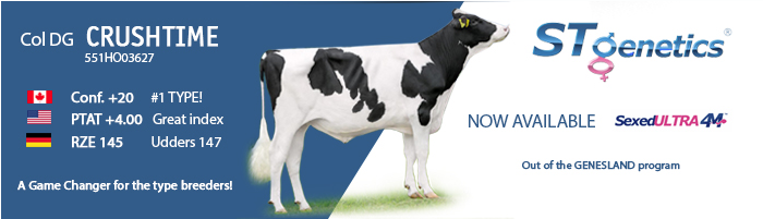 He is the type sensation in the breed: Col DG Crushtime which is Ultra 4M sexed female available through Sexing Technologies! Crushtime has a PTAT of +4.00 and is the #1 Conformation bull in the World on Canadian base with +20 Conf. as well he scores 145 RZE in the Germany type system. Crushtime brings all in one package of the pedigree he has – CRUSH x MOGUL x EX-90 Meridian x EX-91 Atwood x EX-91 Shottle x Regancrest-PR Barbie! His grand dam is the full sister to Byway @ Semex. Crushtime his mother Oh-River-Syc Mogal Brylan has recently be pictured, click further for the result! NOTE that Crushtime has only 2 full sisters in the world, which are both owned by Genesland in Germany. Click further for more information about this huge ranking sisters!
